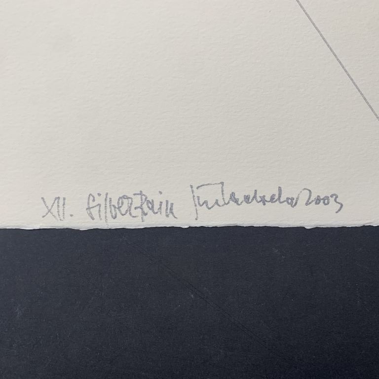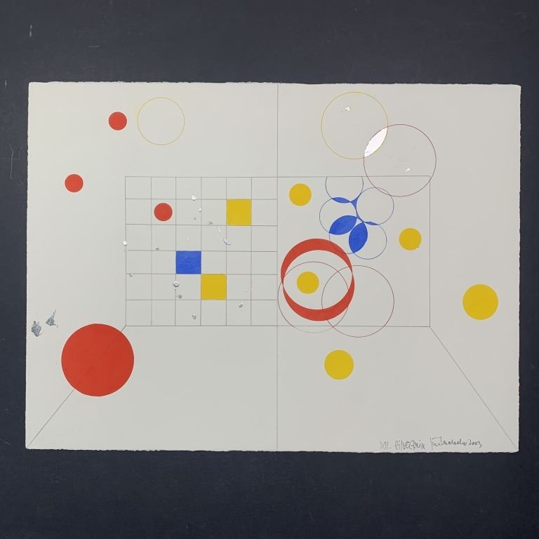 Jiri Ladocha's "Silver Rain XII" original mixed media on paper, circa 2003, signed, titled and dated lower right. Done in Ladocha's signature style of creating a grid-like background, with different shapes, splatters, and designs. This piece is in excellent condition.