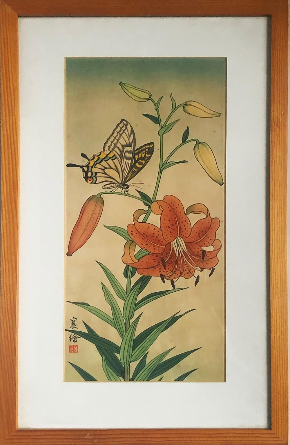 Jo Hashimoto - Butterfly and Tiger Lily (w/Framed) . Published by Kato Junji. Date, 1930's. Measures 18 x 11.Bio: Jo Hashimoto was a Japanese artist active during the 1920's and 1930's.