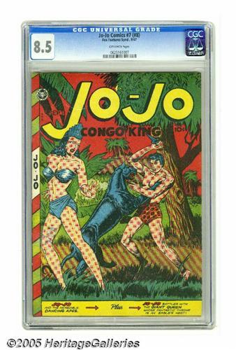 <B>Jo-Jo Comics #7 (#8) (Fox Features Syndicate, 1947) CGC VF+ 8.5 Off-white pages.</B></I> This issue #7 is actually #8, since the previous issue was #7 too. It's also a #2 of sorts, as #1-6 were funny animal comics! Moving on to less confusing matters, we'll note that this title was a fine vehicle for "good girl" art, with the pioneering Matt Baker and Jack Kamen demonstrating their prowess at the genre. Overstreet 2005 VF 8.0 value = $406; VF/NM 9.0 value = $623. CGC census 4/05: 1 in 8.5, 3 higher.