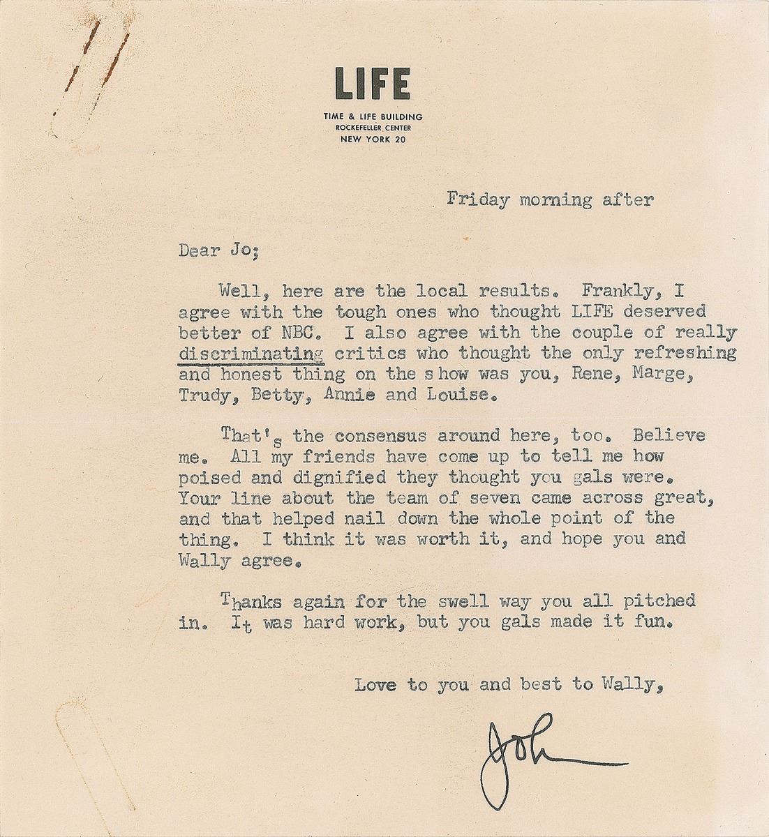 Two TLSs from Time Magazine and Life Magazine, both one page, 6.25 x 6.75 and 7.25 x 11, addressed to Jo Schirra, the wife of Sigma 7 astronaut Wally Schirra. The Time letter, dated March 8, 1961, signed by renowned publisher "Henry R. Luce," in part: "I was very proud indeed to have the wives of the nation's Astronauts appear as part of the interpretation of Life's first quarter century last week. Your attitude toward your unique position and the dignity with which you reflected it contributes importantly to public understanding of your husband's role in the future both of our country and of the world"; and the Life letter, no date, signed "John," in part: "Well, here are the local results. Frankly, I agree with the tough ones who thought Life deserved better of NBC. I also agree with the couple of really discriminating critics who thought the only refreshing and honest thing on the show was you, Rene, Marge, Trudy, Betty, Annie and Louise." In overall fine condition. Accompanied by the original mailing envelope for the Time letter.