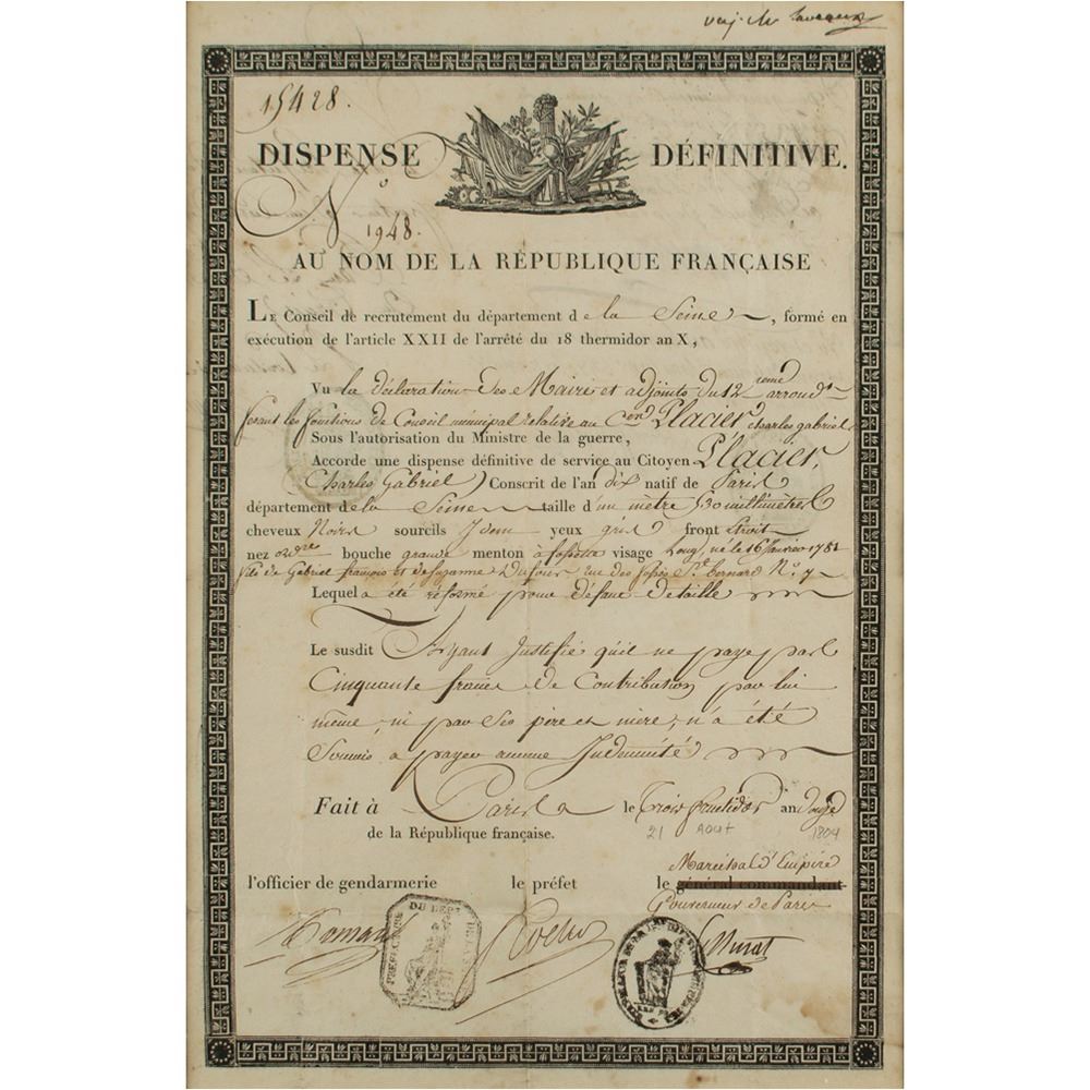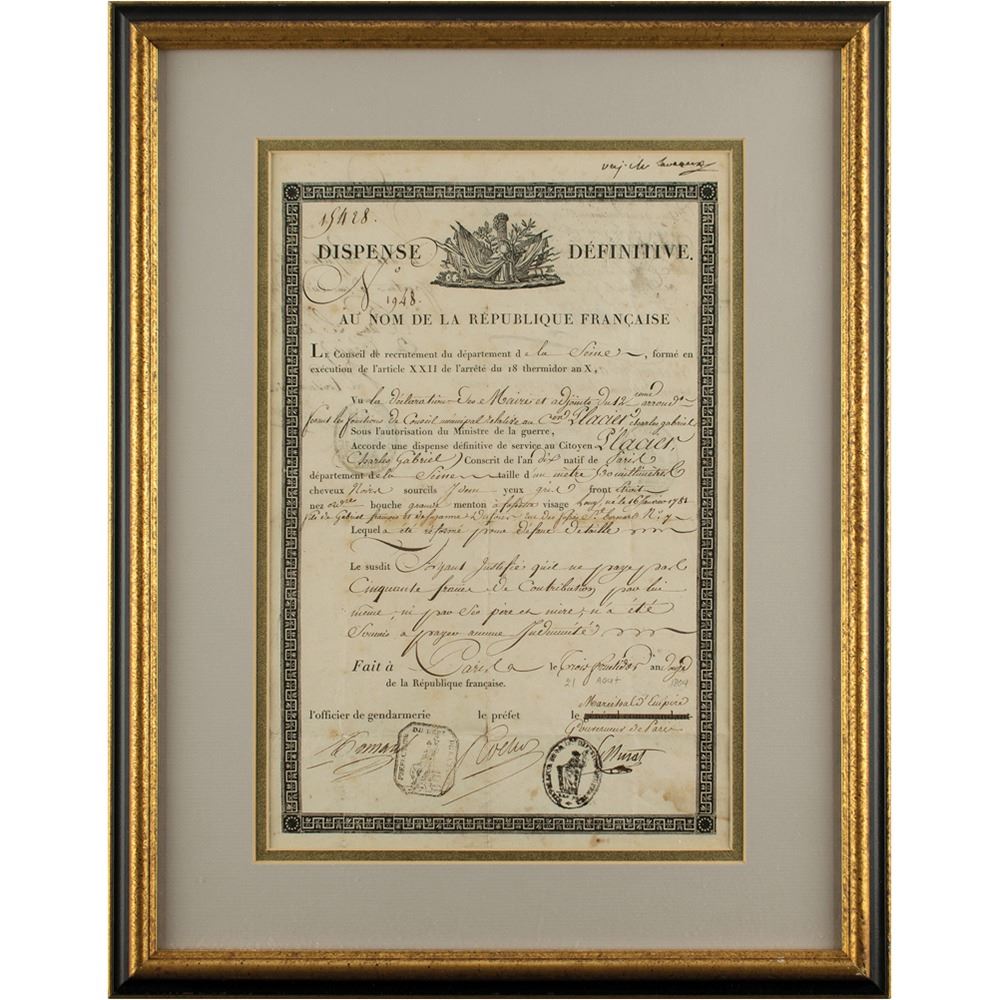 Partly-printed DS, in French, signed “Murat,” one page, 9 x 13.5, August 21, 1804. Official "final dispensation" military document, in part (translated): "The Recruitment Council of the Department of the Seine, form in execution of article XXII of the decree of 18 Thermidor year X…Under the authorization of the Minister of War, Grant a final exemption from service to the Citizen Placier (Charles Gabriel) Conscript of the year ten, native of Paris, department of the Seine." Signed at the conclusion by Murat as Marshal of the Empire and Military Governor of Paris, and countersigned by two other officials. Double-matted and framed to an overall size of 15.25 x 19.5. In very good to fine condition, with intersecting folds, light creasing, and a stain impinging on the signature.