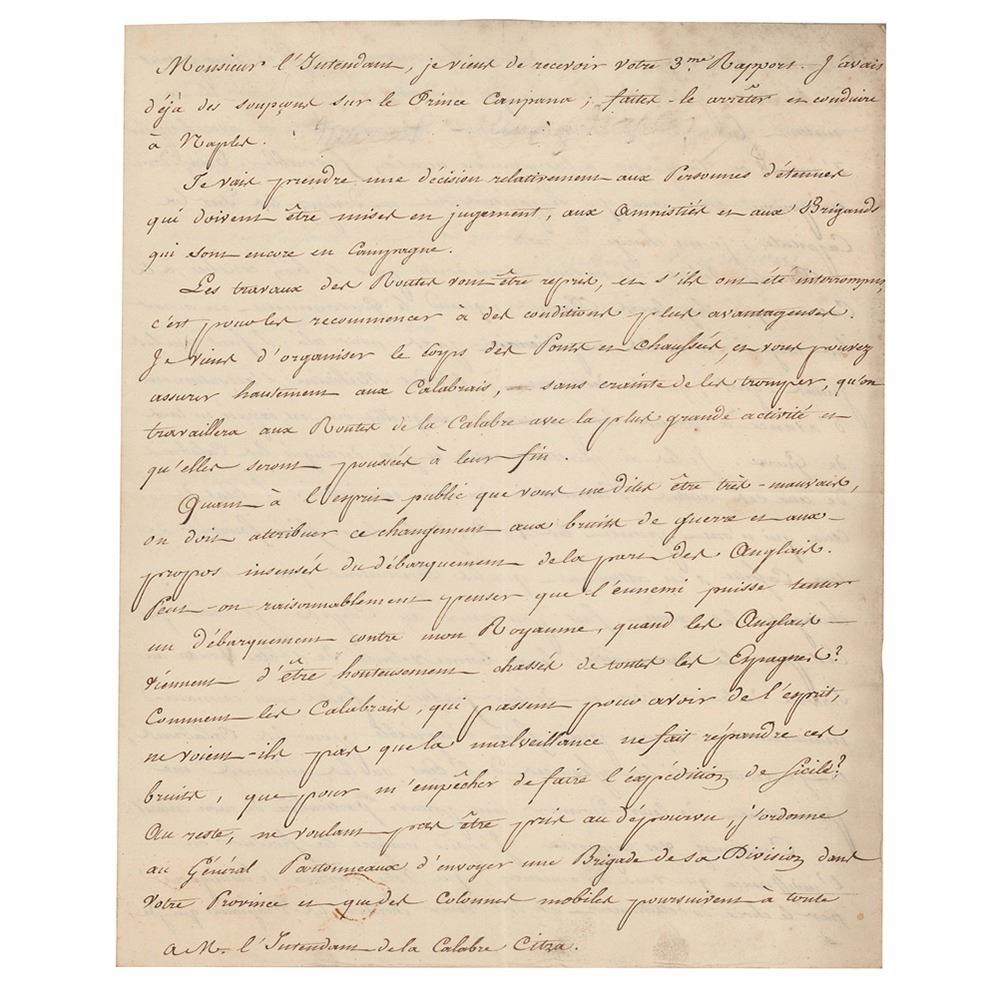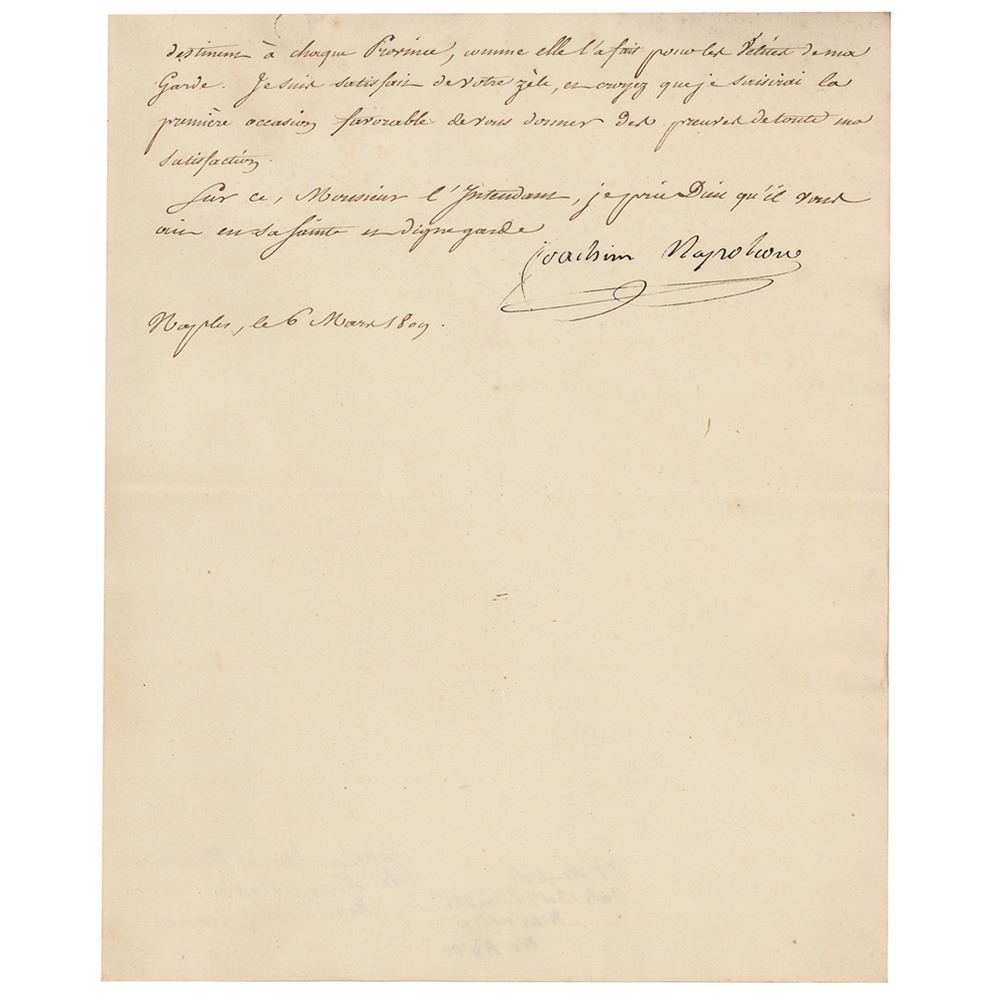 LS in French, signed “Joachim Napoleon,†three pages on two adjoining sheets, 7.75 x 9.75, March 6, 1809. Lengthy untranslated letter signed by Murat as King of Naples. In fine condition.