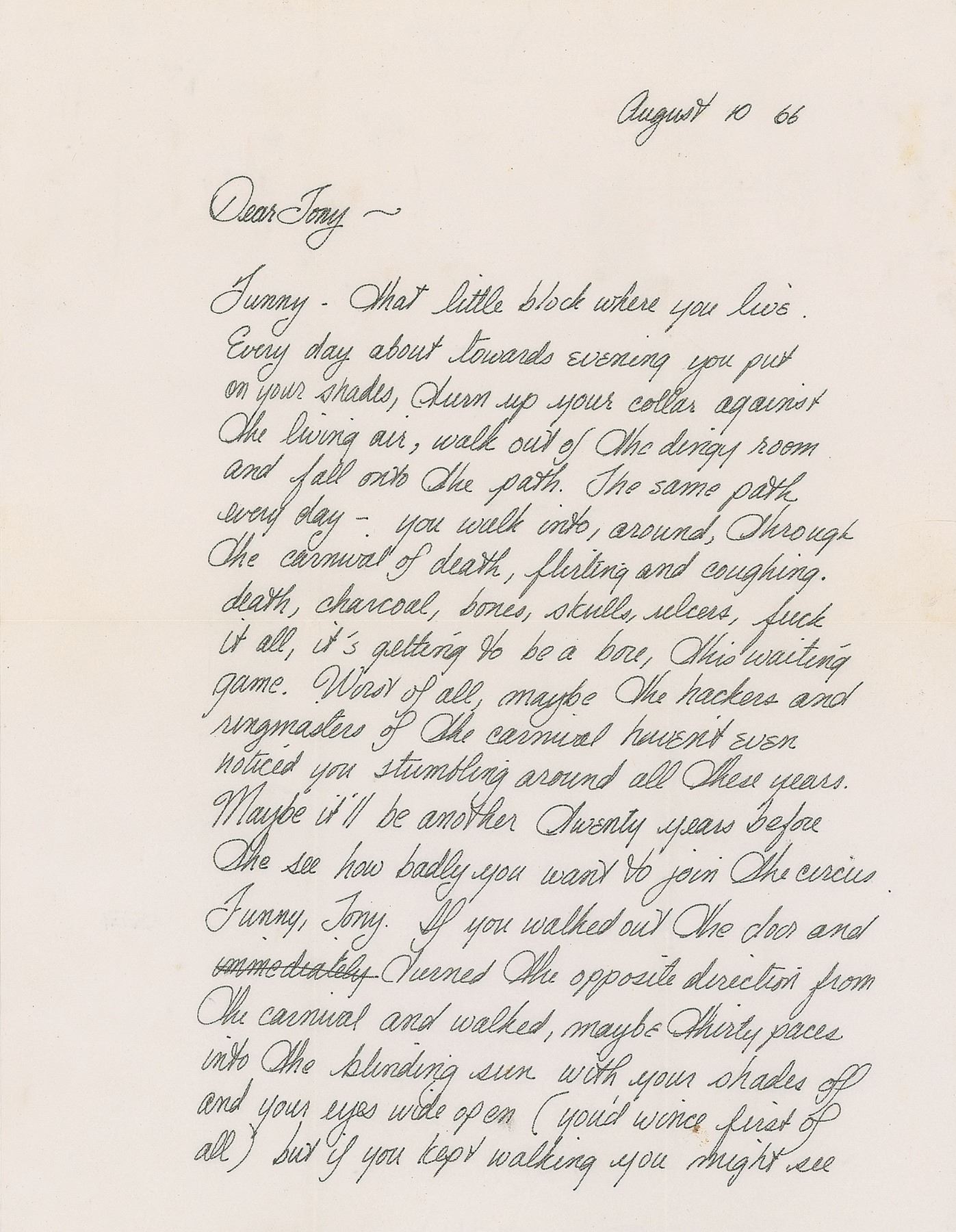 Wonderful ALS, two pages, 8.5 x 11, August 10, 1966. Written from Carmel Valley, a letter to blues musician and music critic David Glover, who also went by Tony ‘Little Sun’ Glover, in full: "Funny, that little block where you live, every day about towards evening you put on your shades, turn up your collar against the living air, walk out of the dingy room and fall onto the path. The same path every day—you walk into, around through the carnival of death, flirting and coughing, death, charcoal, bones, skulls, ulcers, fuck it all, it's getting to be a bore, this waiting game. Worst of all, maybe the hackers and ringmasters of the carnival haven't even noticed you stumbling around all these years. Maybe it'll be another seventy years before the[y] see how badly you want to join the circus. Funny, Tony. If you walked out the door and turned the opposite direction from the carnival and walked, maybe thirty paces into the blinding sun with your shades off and your eyes wide open (you'd wince first of all) but if you kept walking you might see fountains and streams and undiseased children playing in meadows. And if one of those children were to run up to you and take your hand, because she didn't happen to spot the skull and crossbones on your forhead [sic], you might shiver for a second at the shock, and you'd probably cry from fear at losing your death circus, but then you'd be forced to play with the children—to play living life games in the pure air—and in that meadow ablaze with sun and life and laughing, Tony, you couldn't find a dark corner to huddle, because there'd be none, and you couldn't spit blood—children don't know about ulcers. I love you Tony…I dare you, Tony…" In fine condition. Accompanied by the original hand-addressed mailing envelope, with Baez incorporating her signature in the return address field.