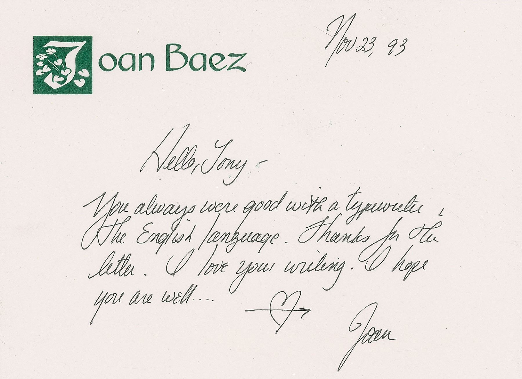 ALS, signed "Joan," one page, penned on her personal 6.25 x 4.5 stationery card, postmarked November 23, 1993 at San Francisco. Letter to blues musician and music critic David Glover, who also went by Tony ‘Little Sun’ Glover, in full: "You always were good with a typewriter & the English language. Thanks for the letter. I love your writing. I hope you are well." In fine condition. Accompanied by the original hand-addressed mailing envelope.