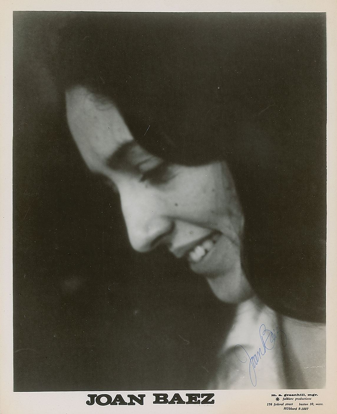 Appealing vintage glossy 8 x 10 publicity photo of Baez for M. A. Greenhill/Folklore Productions, neatly signed in blue ballpoint. In fine condition, with some small surface creases.