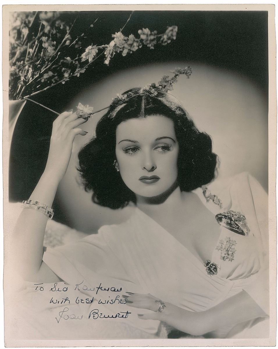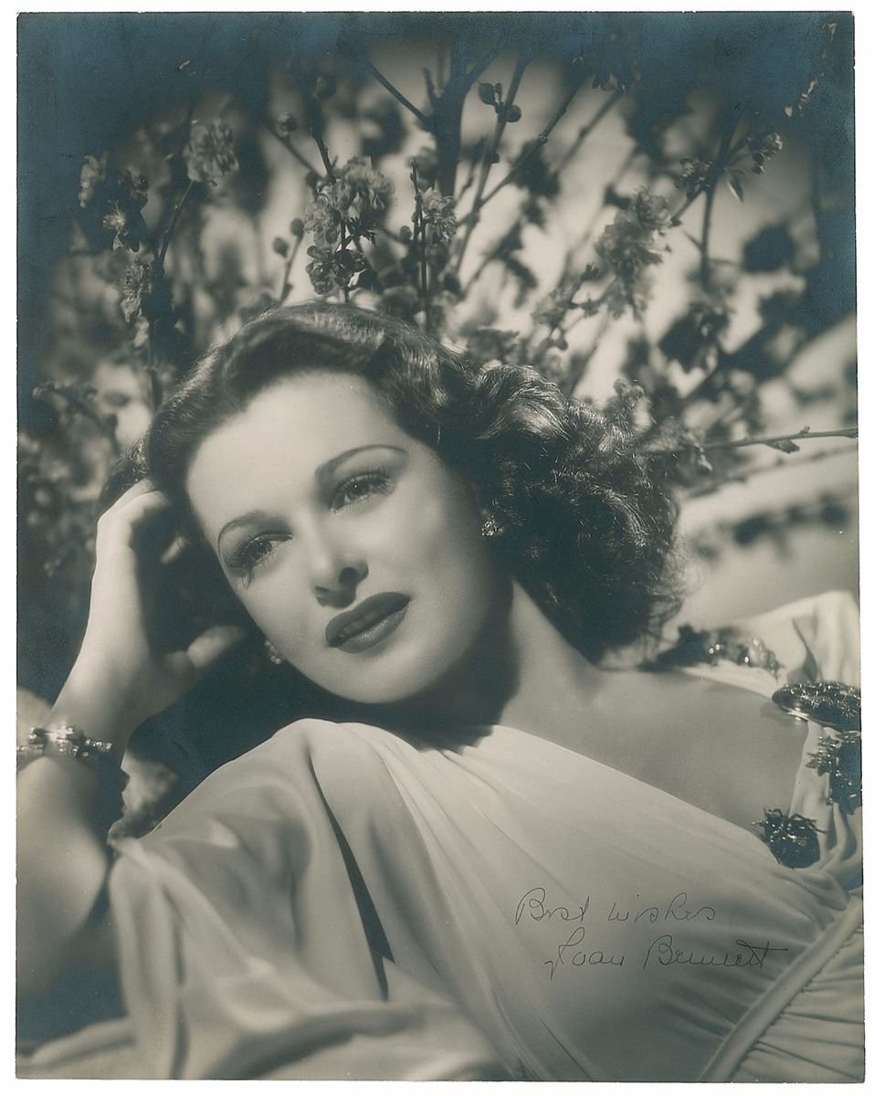 Two vintage photos of the silent film actress: a matte-finish 8 x 10 photo of Bennett pulling a flowered branch, signed and inscribed in fountain pen, “To Sid Kaufman, with best wishes, Joan Bennett”; and an oversized matte-finish 10.5 x 13.25 photo of the femme-fatale, signed in fountain pen, “Best wishes, Joan Bennett.” Reverse of the oversized photo bears an A. L. Whitey Schafer stamp. In overall fine condition, with slight silvering to dark areas of the oversized, and a small tear to left edge and trimmed vertical edges to the 8 x 10.