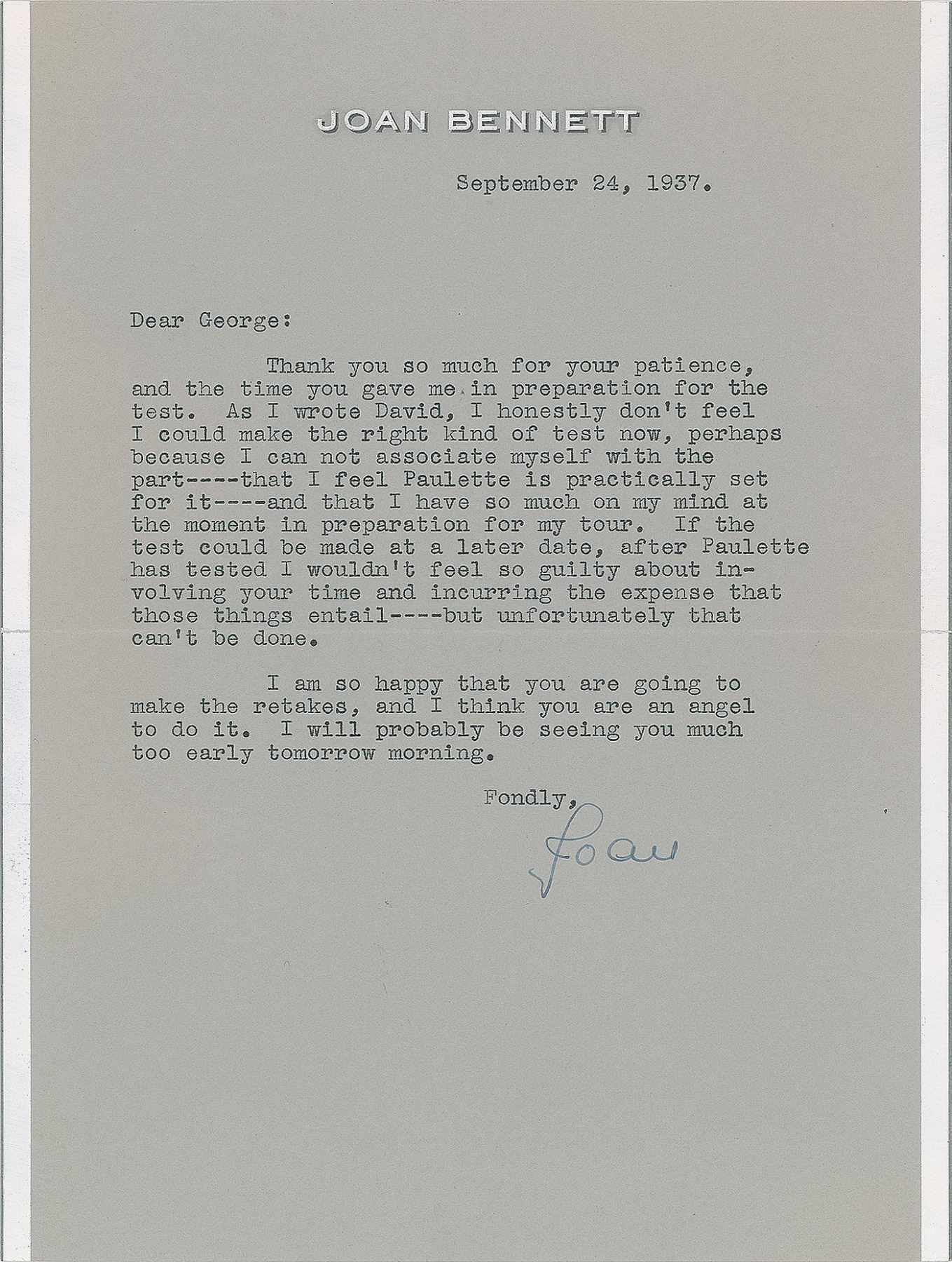 Fascinating TLS signed “Joan,” one page, 7 x 9.25, personal letterhead, September 24, 1937. Letter to director George Cukor, in full: "Thank you so much for your patience, and the time you gave me in preparation for the test. As I wrote David, I honestly don't feel I could make the right kind of test now, perhaps because I can not associate myself with the part—that I feel Paulette is practically set for it—and that I have so much on my mind at the moment in preparation for my tour. If the test could be made at a later date, after Paulette has tested I wouldn't feel so guilty about involving your time and incurring the expense that those things entail—but unfortunately that can't be done. I am so happy that you are going to make the retakes, and I think you are an angel to do it. I will probably be seeing you much too early tomorrow morning." In fine condition. Accompanied by an unsigned glamour photo of Bennett. Bennett was one of many leading Hollywood actresses vying for the part of Scarlett O'Hara in the forthcoming film Gone With the Wind, which was still slated to be directed by Cukor. Other leading ladies hoping for the part included Lana Turner, Paulette Goddard, Bette Davis, and Katharine Hepburn, who hoped her friendship with Cukor would land her the part. One of thirty-one others who screen-tested for the role of O'Hara, Bennett made the final four with Goddard, Jean Arthur, and Vivien Leigh, the latter who was ultimately cast on January 13, 1939. A desirable glimpse into one of Hollywood's most sought-after and legendary roles.
