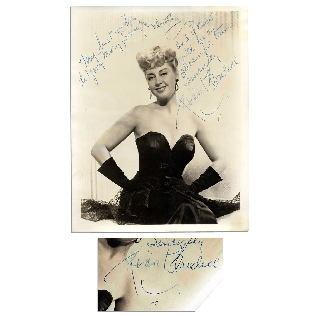 Joan Blondell photo signed. 8'' x 10'' photo bears the actress's autograph inscription, ''My best wishes...Mary, Sonny and Dorothy...a successful team...Joan Blondell''. Near fine.