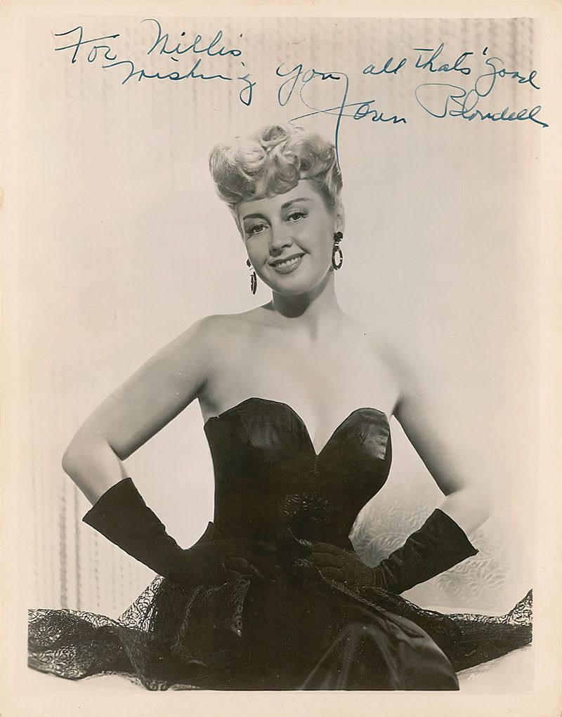 Vintage glossy 8 x 10 photo of Blondell in a low cut cocktail dress, signed and inscribed in fountain pen “For Willis, Wishing you all that’s good, Joan Blondell.” In fine condition, with a few scattered light creases and surface marks.