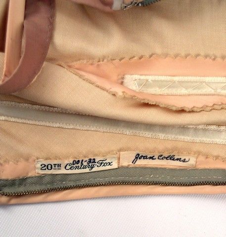 Because Joan Collins erupted into our collective consciences during her days as Alexis Carrington Colby in the Oil Opera "Dynasty" (1981-1989), not to mention her numerous adventures with every species of men throughout the world, and what seems to be her discovery years ago of the fountain of youth, one forgets that Miss Collins was born in London in 1933, and started as a contract starlet in the early 1950's in the British Cinema, and quickly received a contract from 20th Century Fox Studios in Hollywood. This is one of her hero worn satin gowns from her days at 20th. The orignal 20th Century Fox Studio label with her name is sewn in the inside seam.
