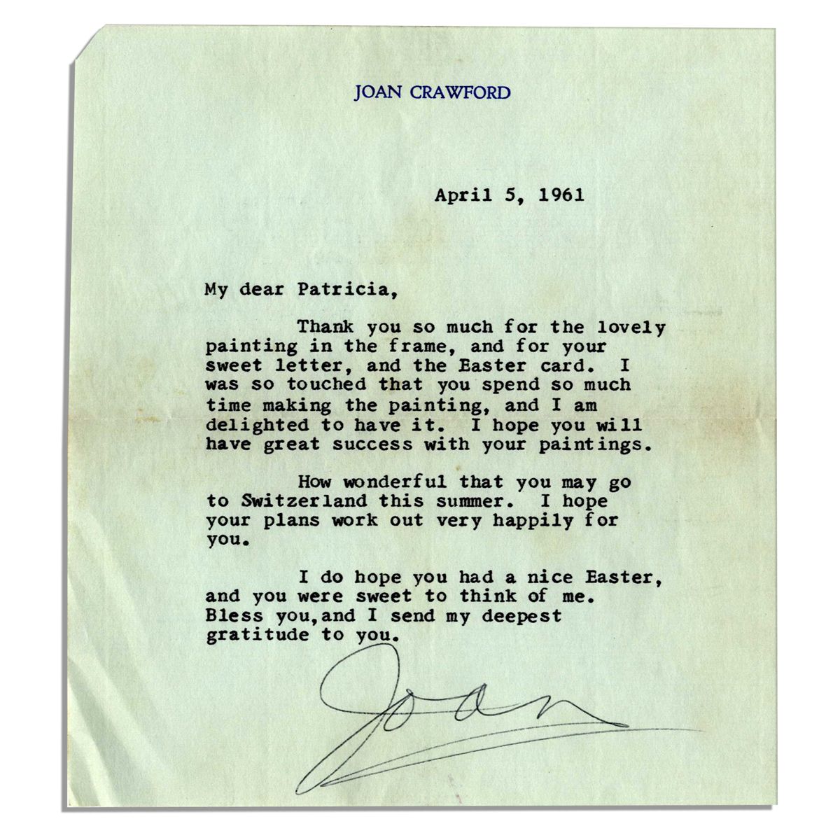 Joan Crawford typed letter signed on her personal stationery, dated 5 April 1961. Written later in her successful career, letter is addressed to Patricia Lahr, a fan, and reads in full: ''Thank you so much for the lovely painting in the frame, and for your sweet letter, and the Easter card. I was so touched that you spend so much time making the painting, and I am delighted to have it. I hope you will have great success with your paintings. How wonderful that you may go to Switzerland this summer. I hope your plans work out very happily for you. I do hope you have a nice Easter, and you were sweet to think of me. Bless you, and I send my deepest gratitude to you.'' Signed in black ink, ''Joan'', signature is large, measuring 3'' x 1.25''. Letter on one page measures 6.25'' x 6.75''. Bent corner and very minor toning, else near fine. Includes original envelope.