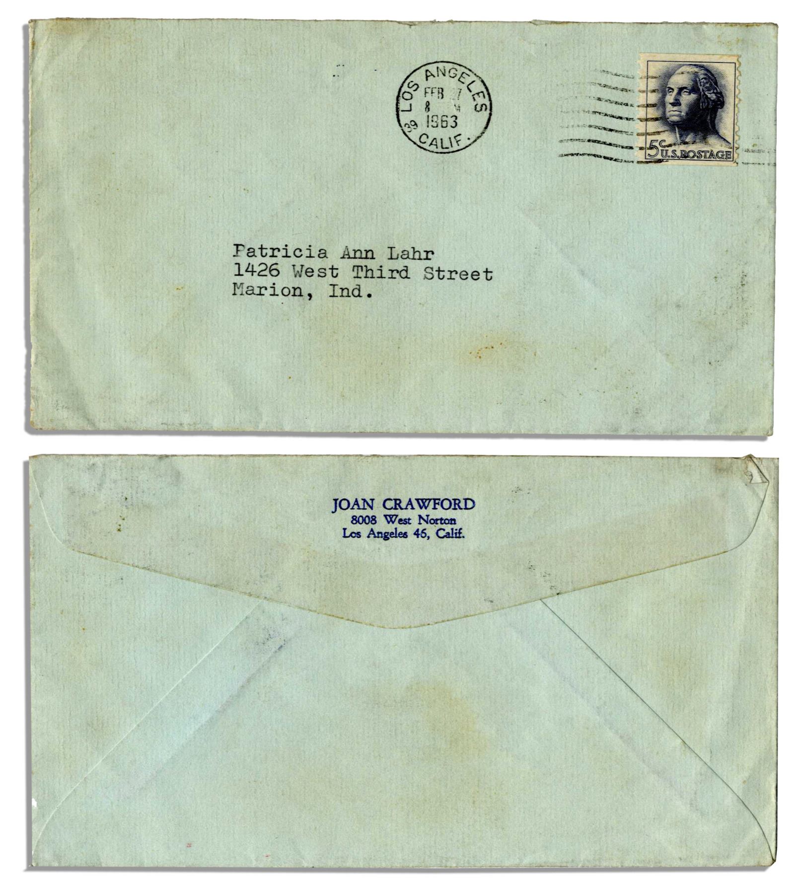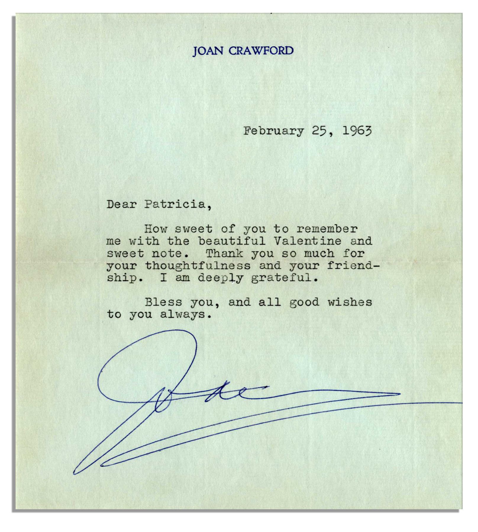 Joan Crawford typed letter signed. Dated 25 February 1963, the Academy Award-winning actress' letter on her personal stationery is addressed to a devoted fan, Patricia Lahr, and reads in full, ''How sweet of you to remember me with the beautiful Valentine and sweet note. Thank you so much for your thoughtfulness and your friendship. I am deeply grateful. Bless you, and all good wishes to you always. [signed] Joan''. Large signature is rendered in blue ink. Single page letter measures 6'' x 7''. Crease at fold through center, overall near fine.