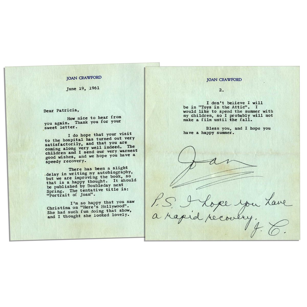 Joan Crawford typed letter signed to a fan, with her handwritten postscript signed. Letter, dated 19 June 1961, was composed on the Best Actress Oscar-winner's personal stationery just before filming her acclaimed 1962 drama ''What Ever Happened to Baby Jane?'' opposite Bette Davis. Letter reads in part, ''Dear Patricia...The children and I send our very warmest good wishes...There has been a light delay in writing my autobiography, but we are improving the book...the tentative title is 'Portrait of Joan'. I'm so happy that you saw [my daughter] Christina on 'Here's Hollywood'. She had such fun doing that show, and I thought she looked lovely. I don't believe I will be in 'Toys in The Attic'. I would like to spend the summer with my children, so I probably will not make a film until the fall...[signed] Joan''. She then handwrites, ''P.S. I hope you have a rapid recovery. J.C.'' 2pp. letter on 2 sheets measures 6'' x 7''. Crease from folding, else near fine.