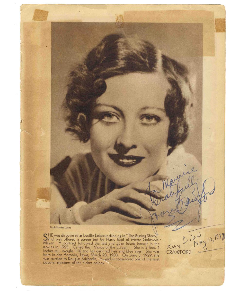 Joan Crawford signed magazine photo. Signed and inscribed, ''For Maurice / Gratefully / Joan Crawford''. Someone has written her date of death beneath in an unknown hand. Photo measures 8'' x 10'' with toning and wear throughout, else very good.