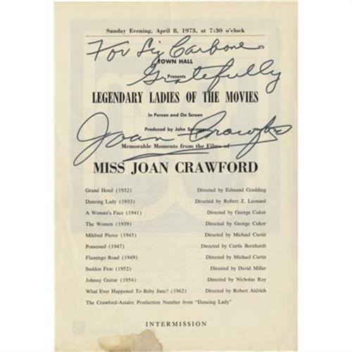 <B>Joan Crawford Signed Program Book and Early Photograph.</B></I> A program book for an evening with Crawford produced as part of the Town Hall "Legendary Ladies of the Movies" series in 1973, inscribed and signed on the inside by Crawford in black felt tip. Accompanied by a b&w 8" x 10" photo of the actress. The program is in Fine to Very Fine condition with some staining to the bottom edge that does not affect the signature; the photo is in Excellent condition.<BR><BR><b>Shipping:</b> Flat Material, Small (<a target="_blank" href="http://www.heritageauctions.com/common/shipping.php">view shipping information</a>)