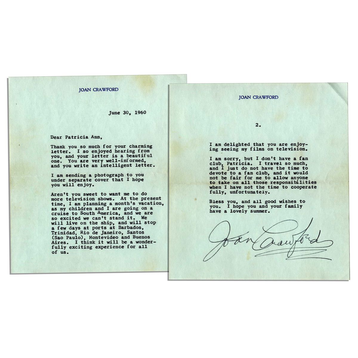 Joan Crawford typed letter signed. Crawford writes to a fan on her personal stationery. Letter, dated 30 June 1960 reads in full, ''Dear Patricia Ann, Thank you so much for your charming letter. I so enjoyed hearing from you, and your letter is a beautiful one. You are very well-informed, and you write an intelligent letter. I am sending a photograph to you under separate cover that I hope you will enjoy. Aren't you sweet to want me to do more television shows. At the present time, I am planning a month's vacation, as my children and I are going on a cruise to South America, and we are so excited we can't stand it. We will live on the ship, and will stop a few days at ports at Barbados, Trinidad, Rio de Janeiro, Santos (Sao Paulo), Montevideo and Buenos Aires. I think it will be a wonderfully exciting experience for all of us. I am delighted that you are enjoying seeing my films on television. I am sorry, but I don't have a fan club, Patricia. I travel so much, and I just do not have the time to devote to a fan club, and it would not be fair for me to allow anyone to take on all those responsibilities when I have not the time to cooperate fully, unfortunately. Bless you, and all good wishes to you. I hope you and your family have a lovely summer. [signed] Joan Crawford''. 2pp. letter on 2 sheets is signed in black ink. Measures 6.25'' x 7''. Crease at fold through center, overall near fine.
