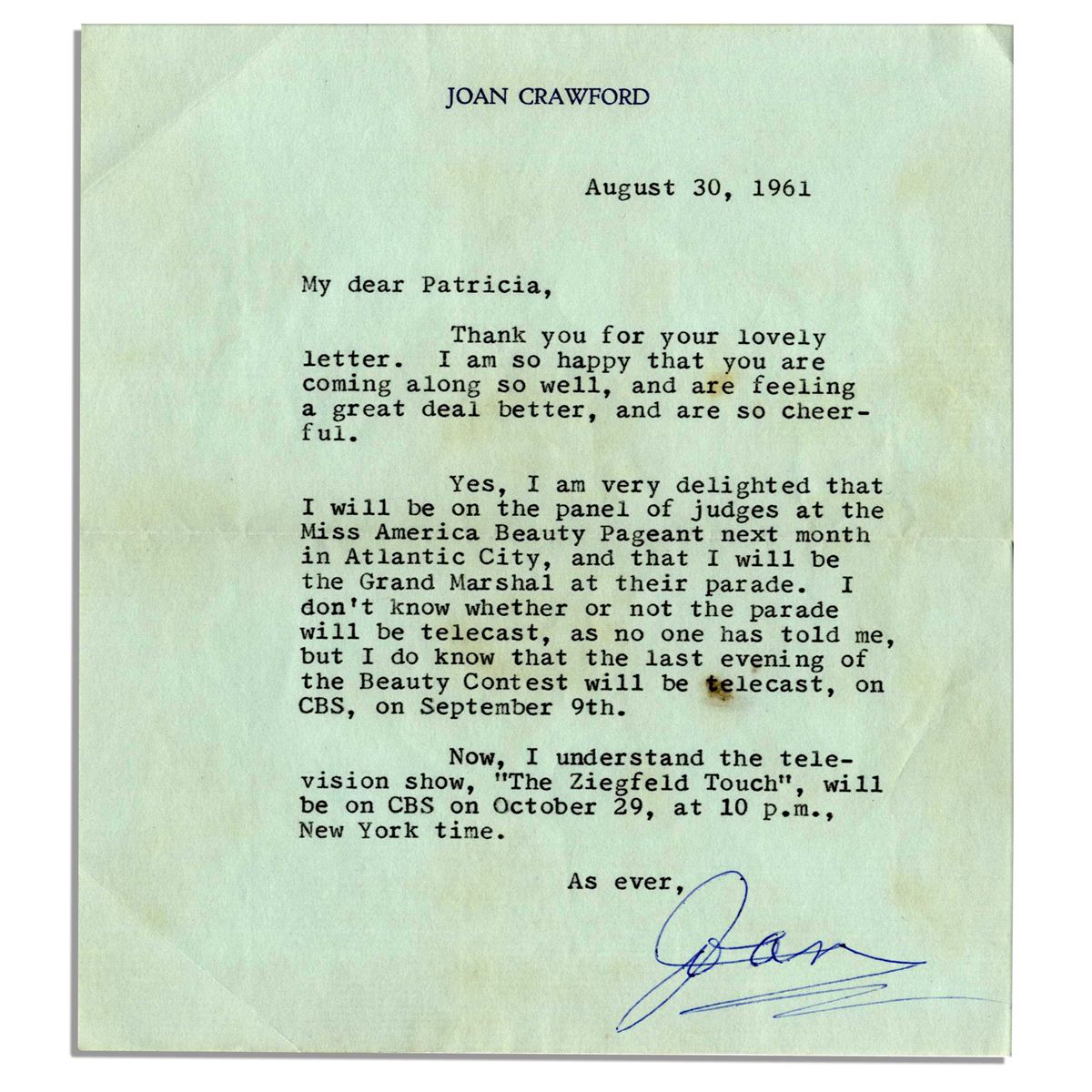 Joan Crawford typed letter signed. Letter to a fan in Indiana on her personal stationery is dated 30 August 1961 and reads in part, ''...I am very delighted that I will be on the panel of judges at the Miss America Beauty Pageant next month in Atlantic City, and that I will be the Grand Marshal at their parade. I don't know whether or not the parade will be telecast, as no one has told me, but I do know that the last evening of the Beauty Contest will be telecast, on CBS, on September 9th. Now, I understand the television show, 'The Ziegfeld Touch' will be on CBS on October 29, at 10 p.m., New York time. As ever, [signed] Joan''. Signature appears in blue ink. Single-page letter measures 6.25'' x 7''. Ink spot to verso showing through slightly in the lower right quadrant, else near fine.