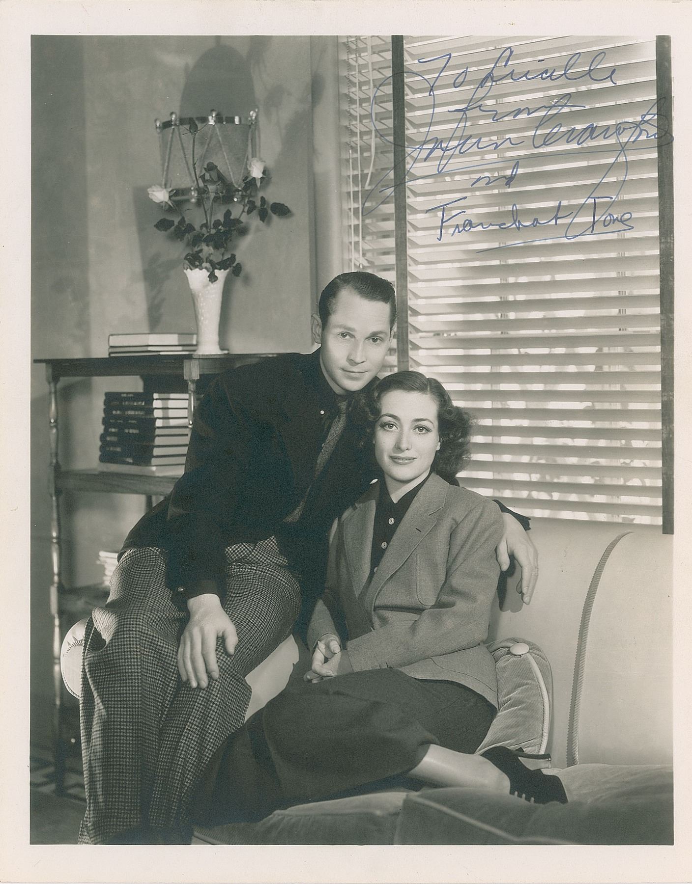 Excellent vintage matte-finish 8 x 10 photo of the 1930s Hollywood power couple, signed and inscribed in fountain pen, "To Lucille, from Joan Crawford" and "Franchot Tone.” Reverse bears an MGM/Hurrell credit stamp. In very fine condition.