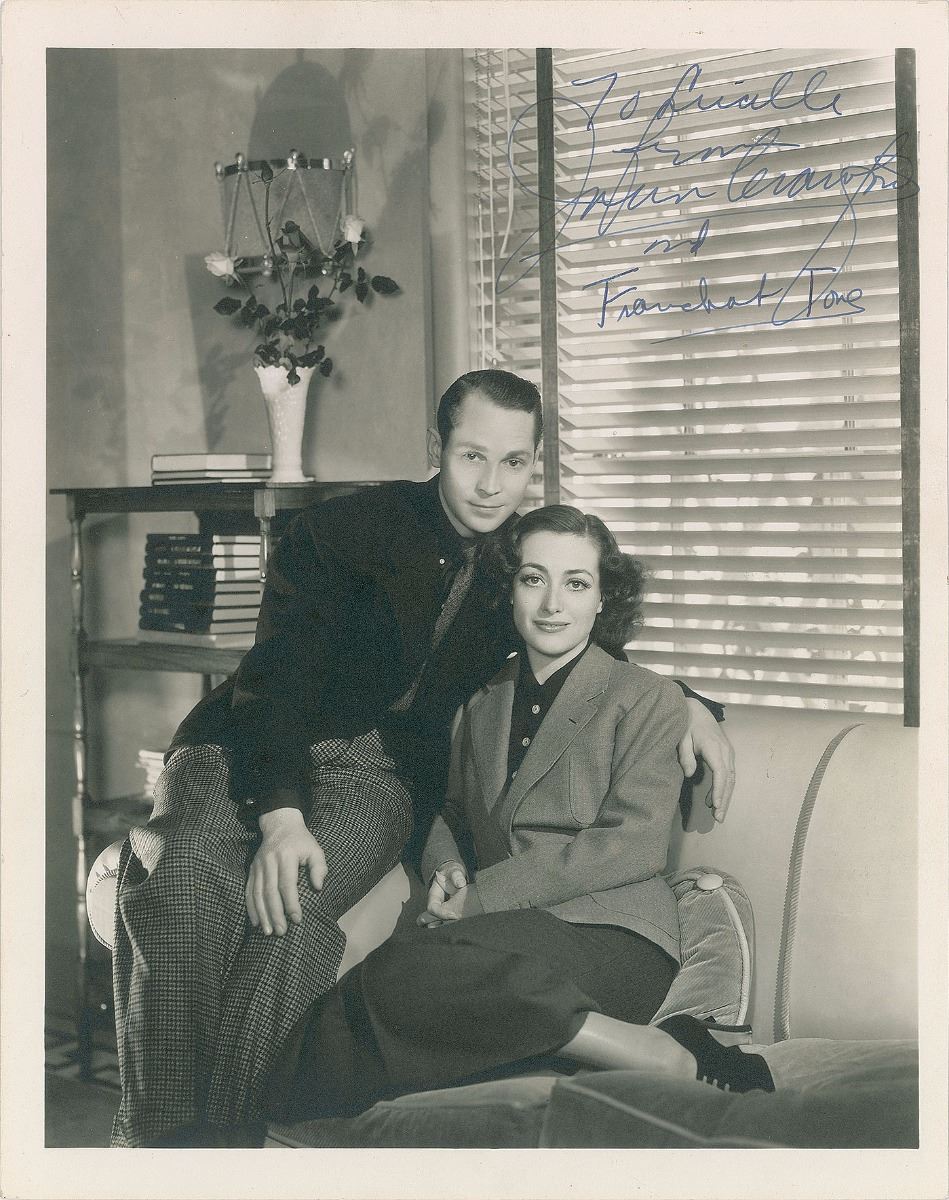 Vintage matte-finish 8 x 10 photo of the Hollywood couple, signed and inscribed in blue ink, “To Lucille, from Joan Crawford,” and “and Franchot Tone.” Reverse bears an MGM/Hurrell credit stamp. In fine condition.