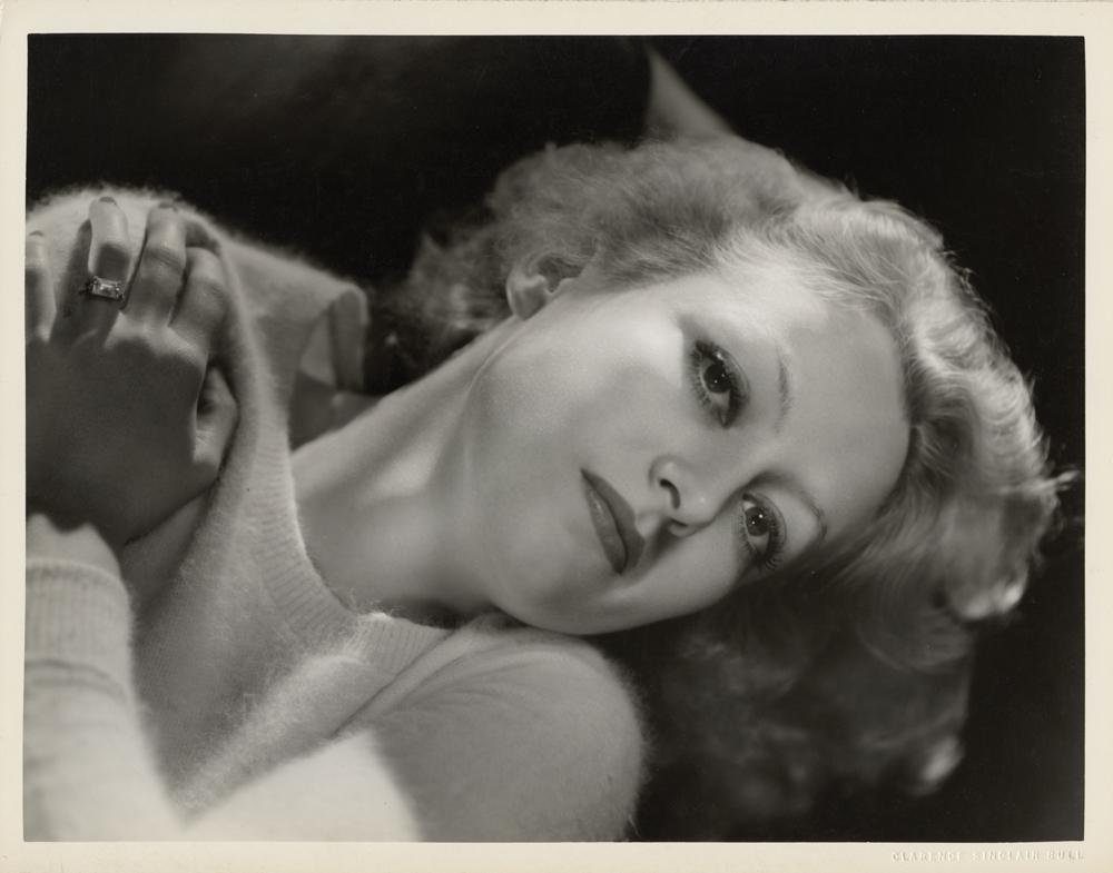 Gelatin silver glossy double-weight 10 x 13 in. print of Joan Crawford by Clarence Sinclair Bull; with blind embossed stamp, photographer and M-G-M rubber stamp and portrait number B-2280 in pencil on the verso. Fine; with faint paper clip impressions at the right edge and pin size impression at the lower center.