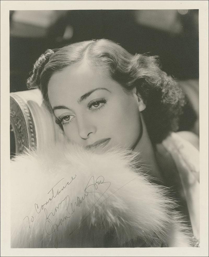 Beautiful vintage matte-finish 8 x 10 photo of Crawford dreamily gazing off, surrounded by white fur, signed and inscribed in black fountain pen “To Constance, from Joan Crawford.” In fine condition, with moderate signature contrast to first name.