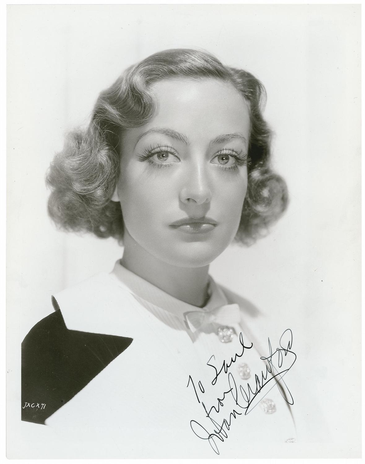 Mesmerizing vintage glossy 8 x 10 photo of Crawford looking intently into the camera, signed and inscribed in-person in fountain pen “To Saul from Joan Crawford.” Reverse of photo bears collector’s stamp date of October 14, 1935, the date the signature was acquired. In fine condition, with a few scattered light surface impressions and a diagonal streak to emulsion through portion of facial area. An exceptional portrait from the beginning of Crawford’s illustrious career. Saul Goodman Collection.