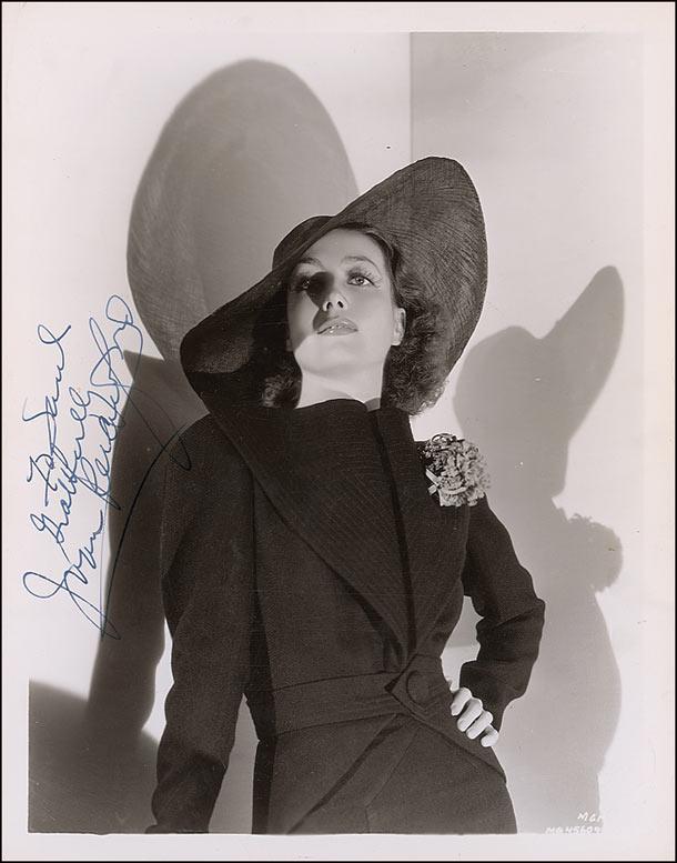 Glamorous vintage glossy 8 x 10.25 photo of the actress in black and casting a dramatic double shadow on the white-walled background, signed and inscribed vertically, in-person in fountain pen, “To Saul, Gratefully, Joan Crawford.” Reverse of photo bears collector’s stamp date of June 13, 1936, the date the signature was acquired. In fine condition, with trivial corner creasing and light surface impressions. Saul Goodman Collection.