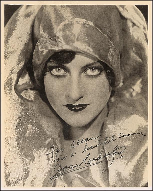 Glossy 8 x 10 photo, signed and inscribed in black felt tip “For Allan, have a beautiful summer, Joan Crawford.” In fine condition, with a bit of mild staining to finish, as well as some scattered light golding.