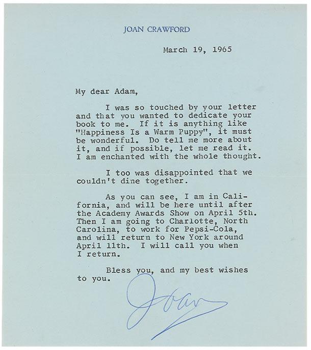 TLS signed “Joan,” one page, 6.25 x 7, personal letterhead, March 19, 1965. Letter to a friend and author. In part: “I was so touched by your letter and that you wanted to dedicate your book to me. If it is anything like ‘Happiness Is a Warm Puppy’ it must be wonderful. Do tell me more about it…As you can see, I am in California, and will be here until after the Academy Awards Show…Then I am going to Charlotte…to work for Pepsi-Cola.” In fine condition.
