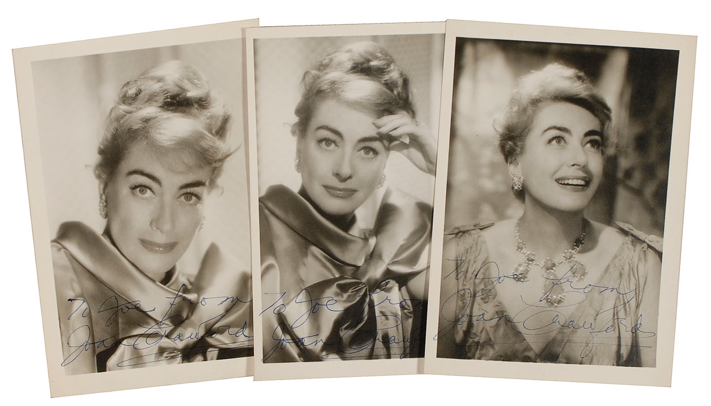 Three matte-finish 5 x 7 photos, each featuring a head-and-shoulders shot of Crawford draped in lush evening gowns and jewelry, and all signed and inscribed in blue ink, “To Joe, from Joan Crawford.” In fine condition, with light, uniform toning.