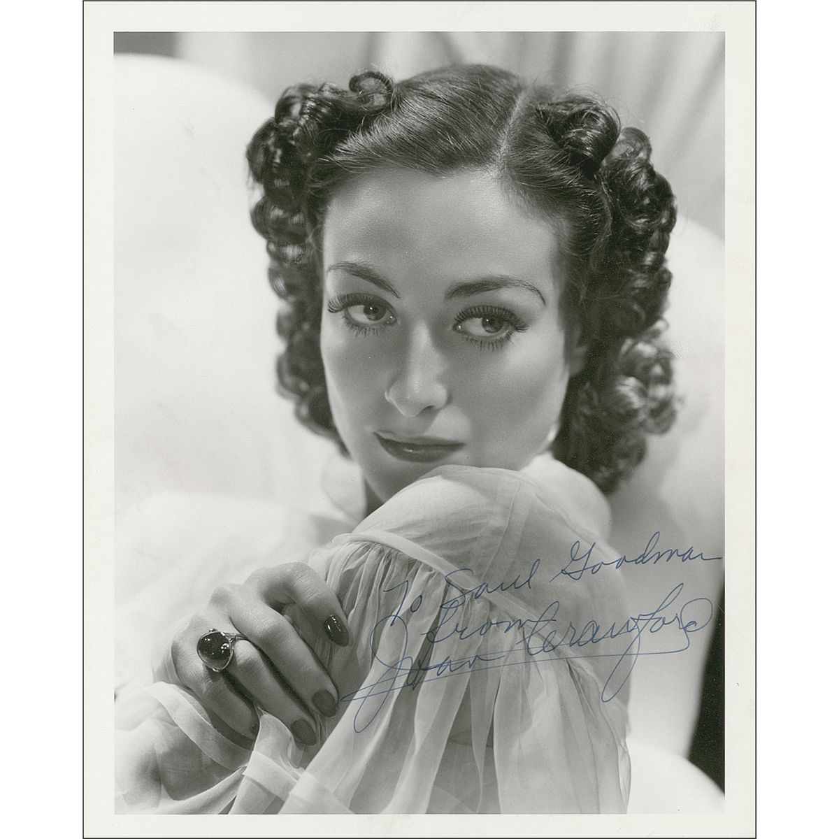 Lovely vintage matte-finish 8 x 10 MGM Hurrell publicity photo of Crawford looking over her shoulder, signed and inscribed in-person in fountain pen “To Saul Goodman from Joan Crawford.” Reverse of photo bears collector’s stamp date of March 10, 1937, the date the signature was acquired. In fine condition. Saul Goodman Collection.