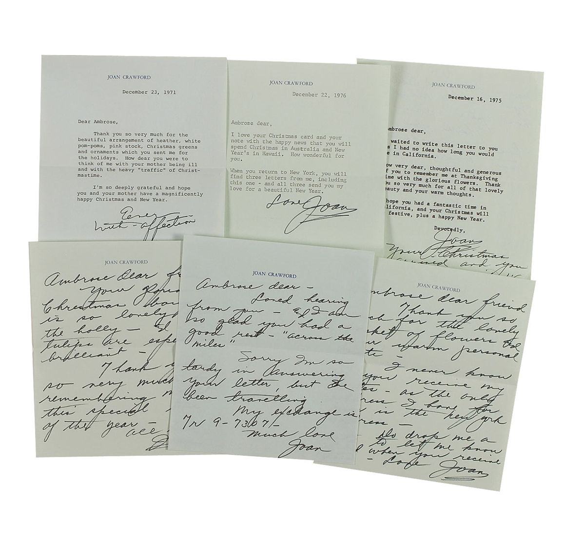 Five letters boldly signed “Joan,” three ALSs and two TLSs, one featuring a handwritten post script, all measuring 6 x 7 on personal stationery, and all dating from 1971 through 1976. Addressed to “Ambrose dear,” Crawford sends thanks for holiday wishes and gifts. In fine condition, with some light creasing. Accompanied by five original mailing envelopes, two addressed in Crawford’s hand, and an additional TLS, signed, “Ever with appreciation.”