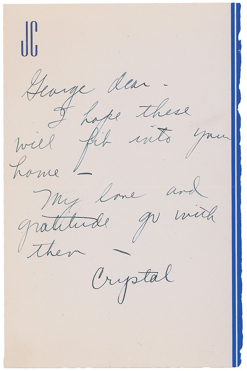 ALS signed “Crystal,” one page, 5.5 x 8.5, personal letterhead, no date. Brief letter to George Cukor. In full: “I hope these will fit into your home—My love and gratitude go with them.” In fine condition.