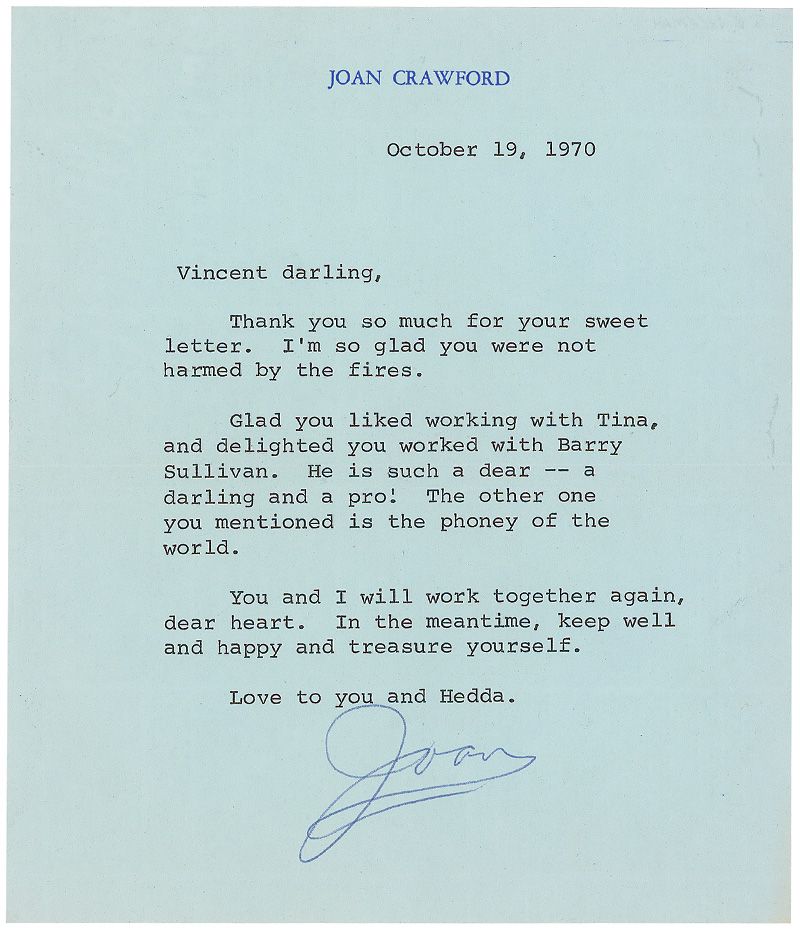 TLS signed “Joan,” one page, 6 x 7, personal letterhead, October 19, 1970. A letter to director Vincent Sherman. In full: “Thank you so much for your sweet letter. I’m so glad you were not harmed by the fires. Glad you liked working with Tina, and delighted you worked with Billy Sullivan. He is such a dear—a darling and a pro! The other one you mentioned is the phoney of the world. You and I will work together again, dear heart. In the meantime, keep well and happy and treasure yourself.” In fine condition, with an extra central horizontal crease. Accompanied by the original mailing envelope.