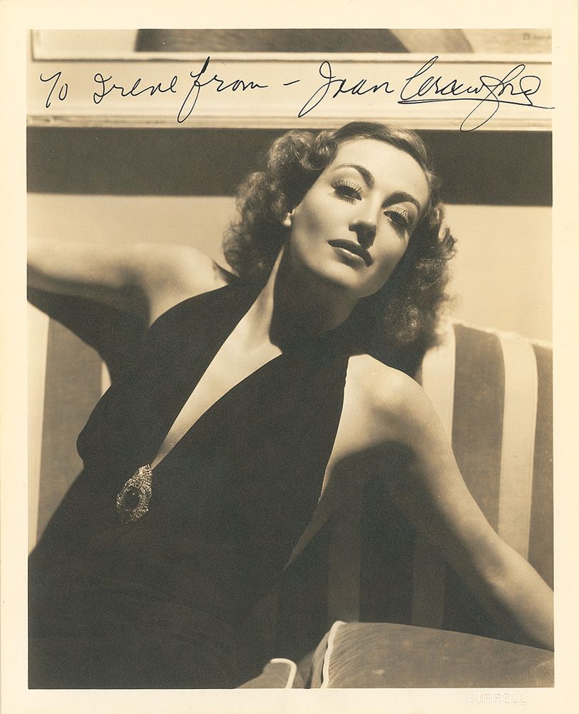 Stunning vintage matte-finish 8 x 10 Hurrell photo of Crawford in a low-cut dress and bathed in shadows, signed and inscribed in fountain pen “To Irene from—Joan Crawford.” In fine condition, with scattered silvering to a few of the darker areas of image and a couple trivial corner bends.