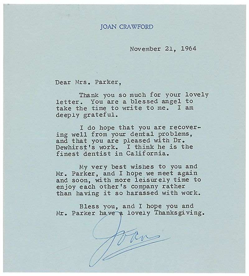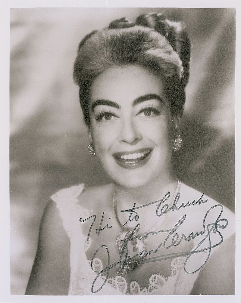 Two items: one matte-finish 8 x 10 photo of Crawford from a 1962 shoot, signed and inscribed in black felt tip, “Hi to Chuck, Joan Crawford”; and a TLS signed “Joan,” one page, 6.25 x 6.75, personal letterhead, November 21, 1964, in part: “I do hope that you are recovering from your dental problems.” Some rippling to edges of photo and slight irregular adhesion to signature, otherwise overall fine condition. Accompanied by an original unsigned Warner Bros. publicity photo of Crawford.