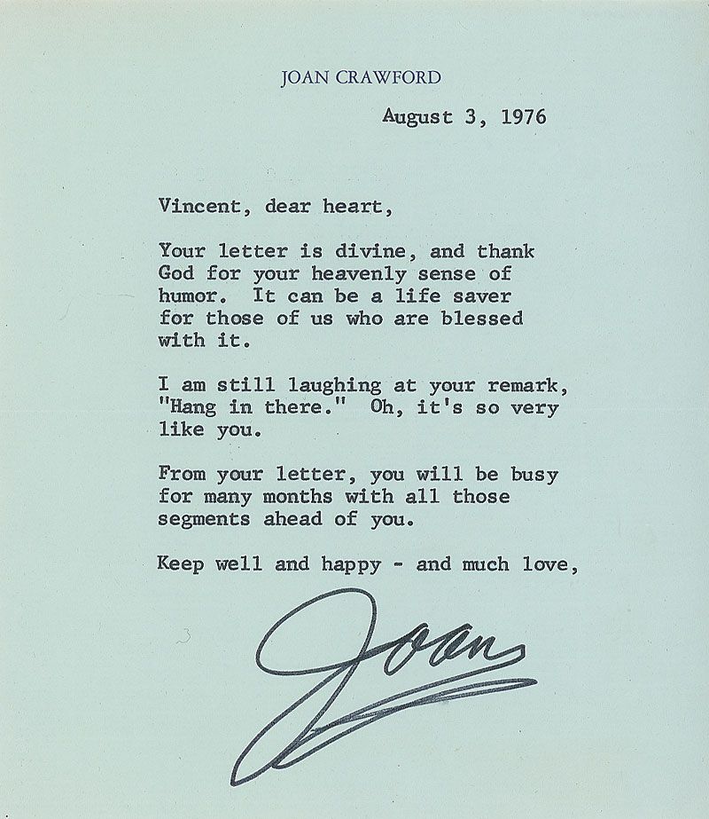 TLS signed “Joan,” one page, 6 x 7, personal letterhead, August 3, 1976. Letter to a friend. In part: “Your letter is divine, and thank God for your sense of humor. It can be a life saver for those of us who are blessed with it. I am still laughing at your remark, ’Hang in there.’ Oh, it’s so very like you.” In fine condition.