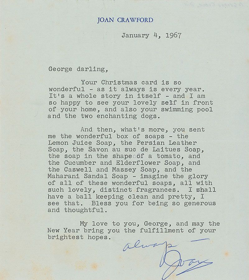 TLS signed “Joan,” one page, 6.25 x 7, personal letterhead, January 4, 1967. Letter to George Cukor. In part: “Your Christmas card is so wonderful…And then, what’s more, you sent me the wonderful box of soaps…imagine the glory of all of these wonderful soaps…I shall have a ball keeping clean and pretty, I see that.” In fine condition, with some light foxing along bottom.