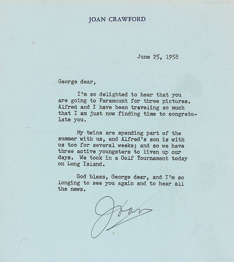 TLS signed “Joan,” one page, 6.25 x 7, personal letterhead, June 25, 1958. Letter to director George Cukor. In part: “I’m so delighted to hear that you are going to Paramount for three pictures.” In fine condition.