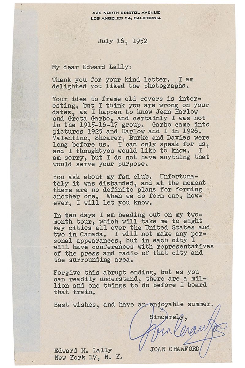 TLS, one page, 5.75 x 9.25, personal letterhead, July 16, 1952. Letter to an admirer. In part: “Your idea to frame old covers is interesting, but I think you are wrong on your dates, as I happen to know Jean Harlow and Greta Garbo, and certainly I was not in the 1915-16-17 group. Garbo came into pictures in 1925 and Harlow and I in 1926. Valentino, Shearer, Burke, and Davies were long before us…You ask about my fan club. Unfortunately it was disbanded, and at the moment there are no definite plans for forming another one.” Letter is affixed to an identical size piece of cardstock. In fine condition, with trimmed edges and a mounting remnant along the reverse of left edge.