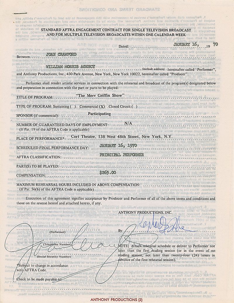 DS, one page, 8.5 x 11, January 16, 1970. Standard AFTRA contract in which Crawford agrees to appear on The Merv Griffin Show on the same day in exchange for $265. Signed at the conclusion in ballpoint by Crawford. A standard AFTRA rider is stapled to the main document at the top. In fine condition, with expected document wear.