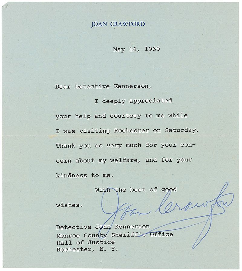 TLS, one page, 6 x 7, personal letterhead, May 14, 1969. Letter of thanks to a Rochester, New York, detective. In full: “I deeply appreciated your help and courtesy to me while I was visiting Rochester on Saturday. Thank you so much for your concern about my welfare, and for your kindness to me.” In fine condition. Accompanied by the original mailing envelope.