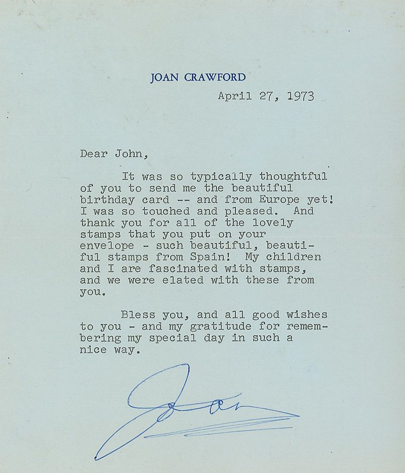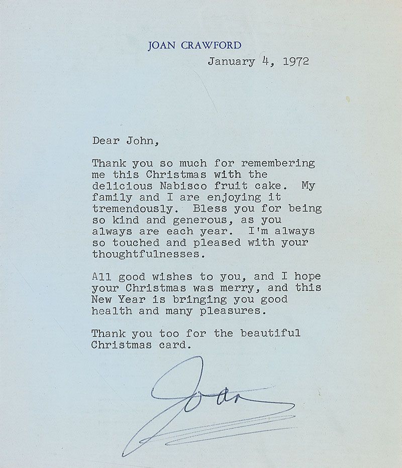 Two TLSs signed “Joan,” each one page, 6 x 7, personal letterhead, January 4 and April 27, 1972. The first, in part: “Thank you so much for remembering me this Christmas with the delicious Nabisco fruit cake.” The second, in part: “Thank you for all of the lovely stamps that you put on your envelope—such beautiful, beautiful stamps from Spain!” In overall fine condition. Both accompanied by their original mailing envelopes.