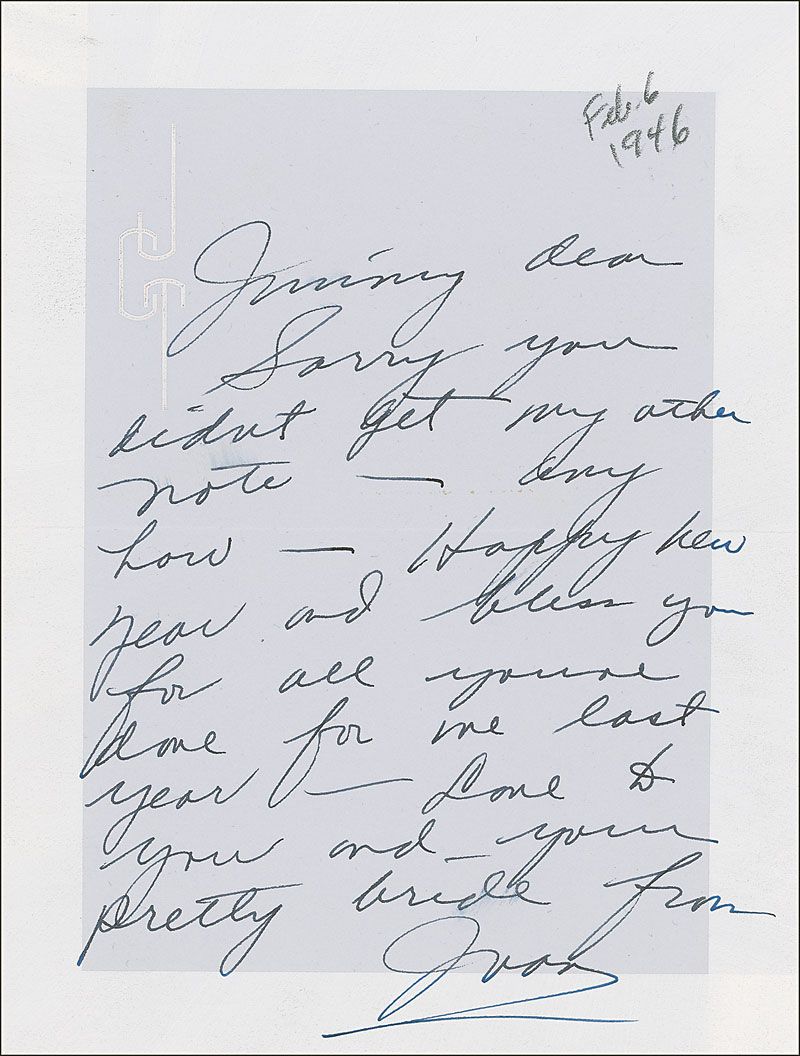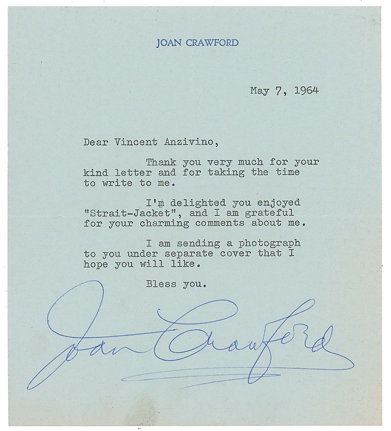 Two one-page letters: ALS, signed “Joan,” 6.5 x 9, on her personal letterhead, to Jimmy sending New Year’s greetings and thanks; and a TLS, signed “Joan Crawford,” 6.25 x 7, to an admirer. In part: “I am delighted you enjoyed ‘Straight-Jacket,’ and I am grateful for your charming comments about me.” Accompanied by the original mailing envelope. In fine condition, with a central horizontal fold to typed letter, as well as a bit of mild toning.