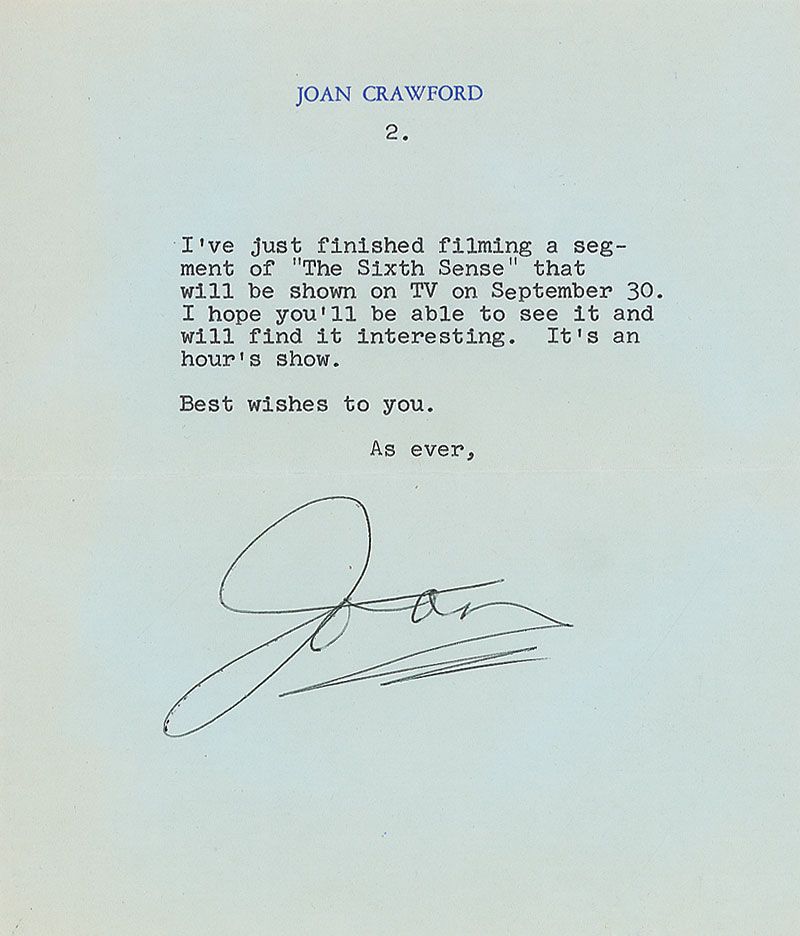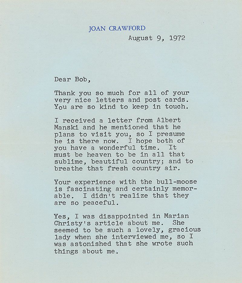 TLS signed “Joan,” two pages, 6 x 7, personal letterhead, September 9, 1972. Letter to Bob Jean of Wells Beach, Maine. In part: “It must be heaven to be in all that sublime, beautiful country; and to breathe that fresh country air. Your experience with the bull-moose is fascinating and certainly memorable. I didn’t realize that they are so peaceful. Yes, I was disappointed in Marian Christy’s article about me. She seemed to be such a lovely, gracious lady when she interviewed me, so I was astonished that she wrote such things about me.” In fine condition. Accompanied by the original mailing envelope.