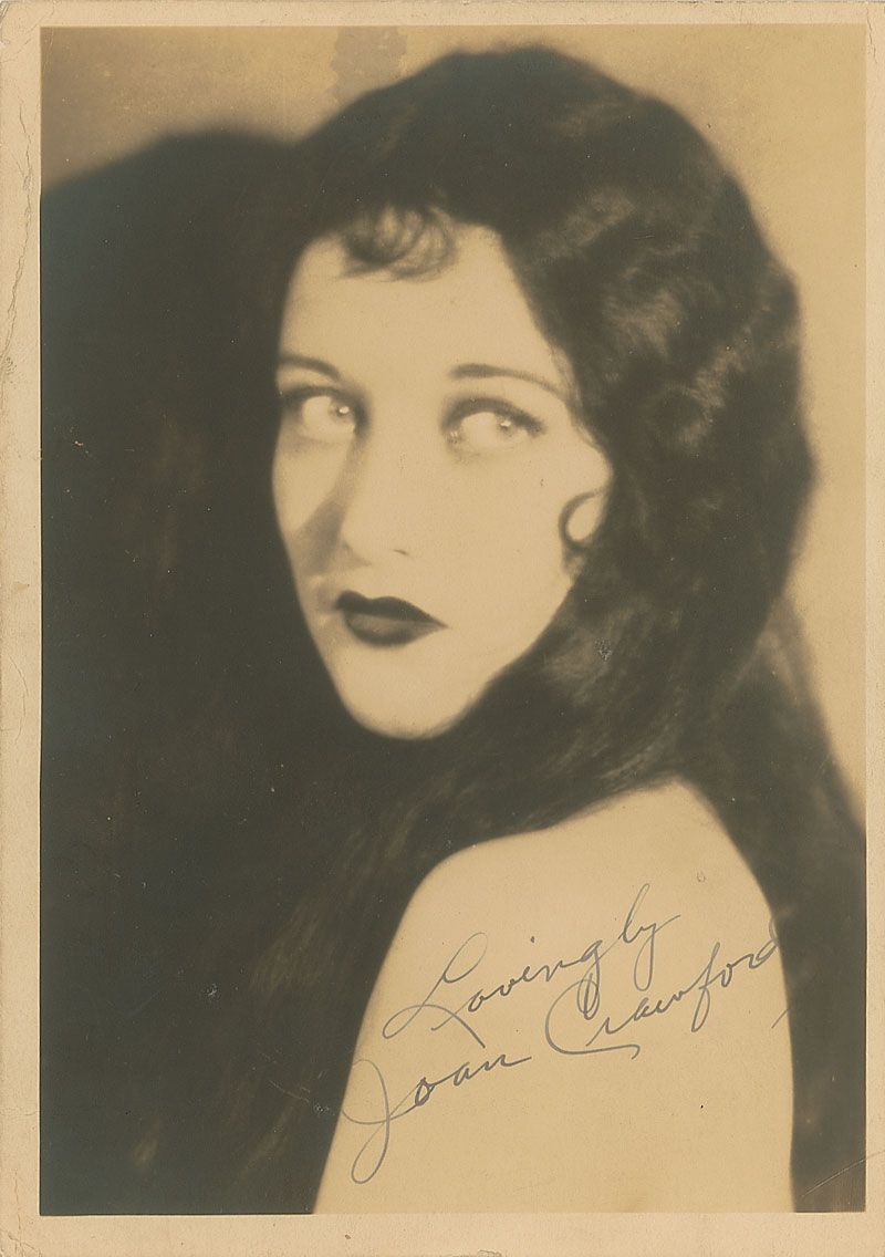 Early vintage matte-finish 5 x 7 portrait of Crawford looking over her shoulder, signed in fountain pen, “Lovingly, Joan Crawford.” Unobtrusive creases to borders and a small stain to the top, otherwise fine condition. A gorgeous pose.