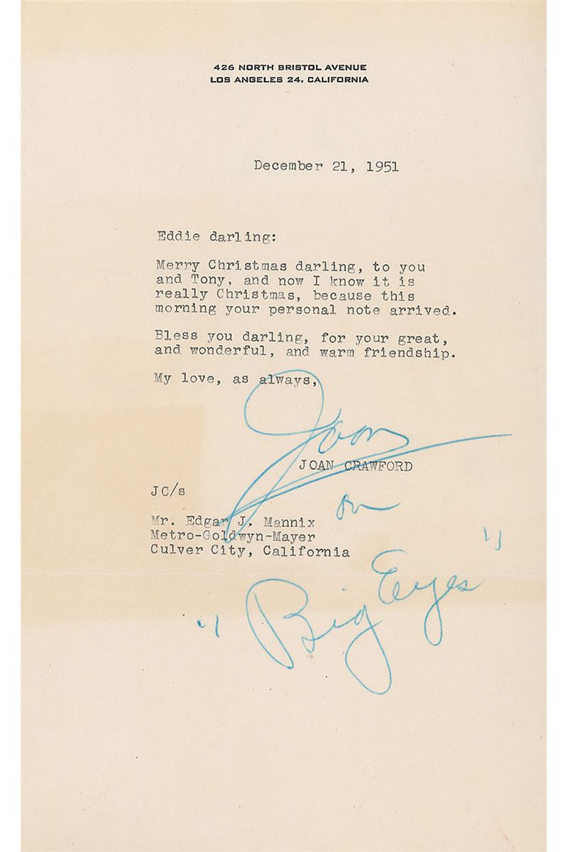 TLS signed “Joan or ‘Big Eyes,’” one page, 6.25 x 10, personal letterhead, December 21, 1951. Letter to MGM executive Eddie Mannix. In part: “Merry Christmas darling, to you and Tony, and I know it is really Christmas, because this morning your personal note arrived.” A few light blocks of toning, otherwise fine condition.