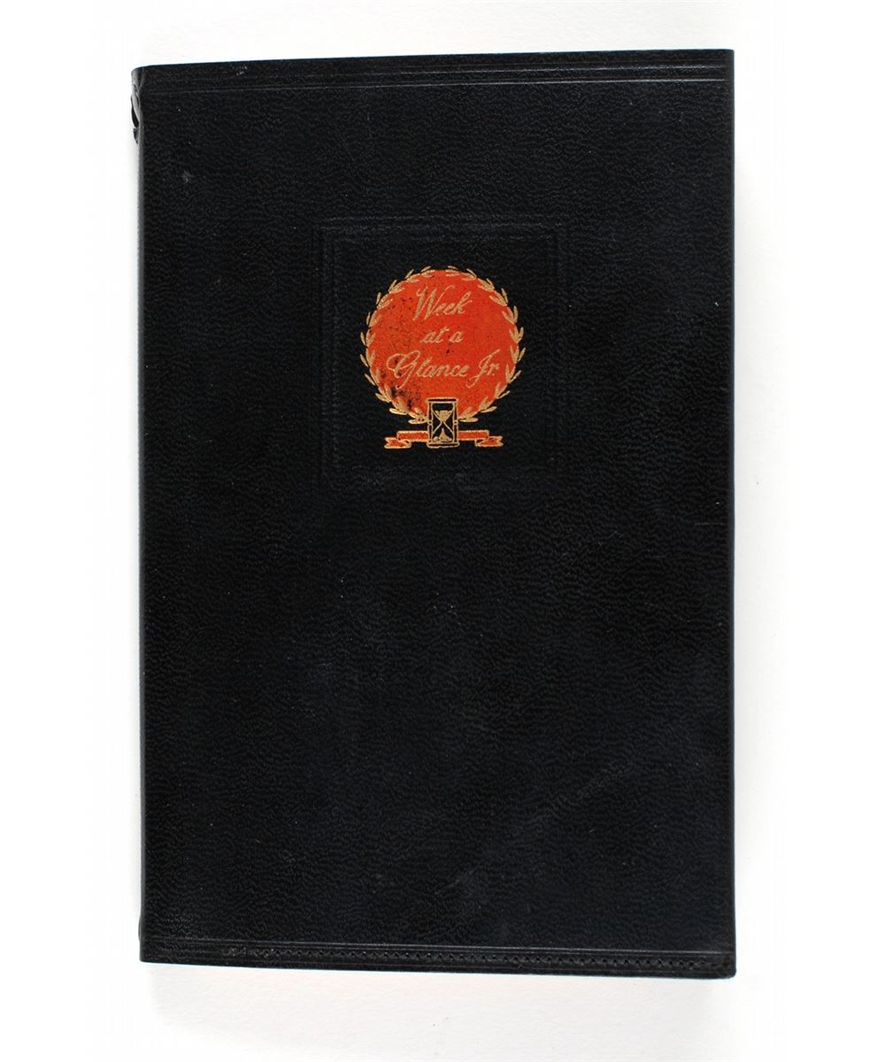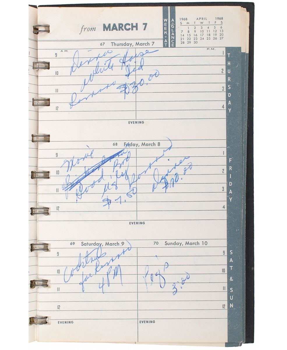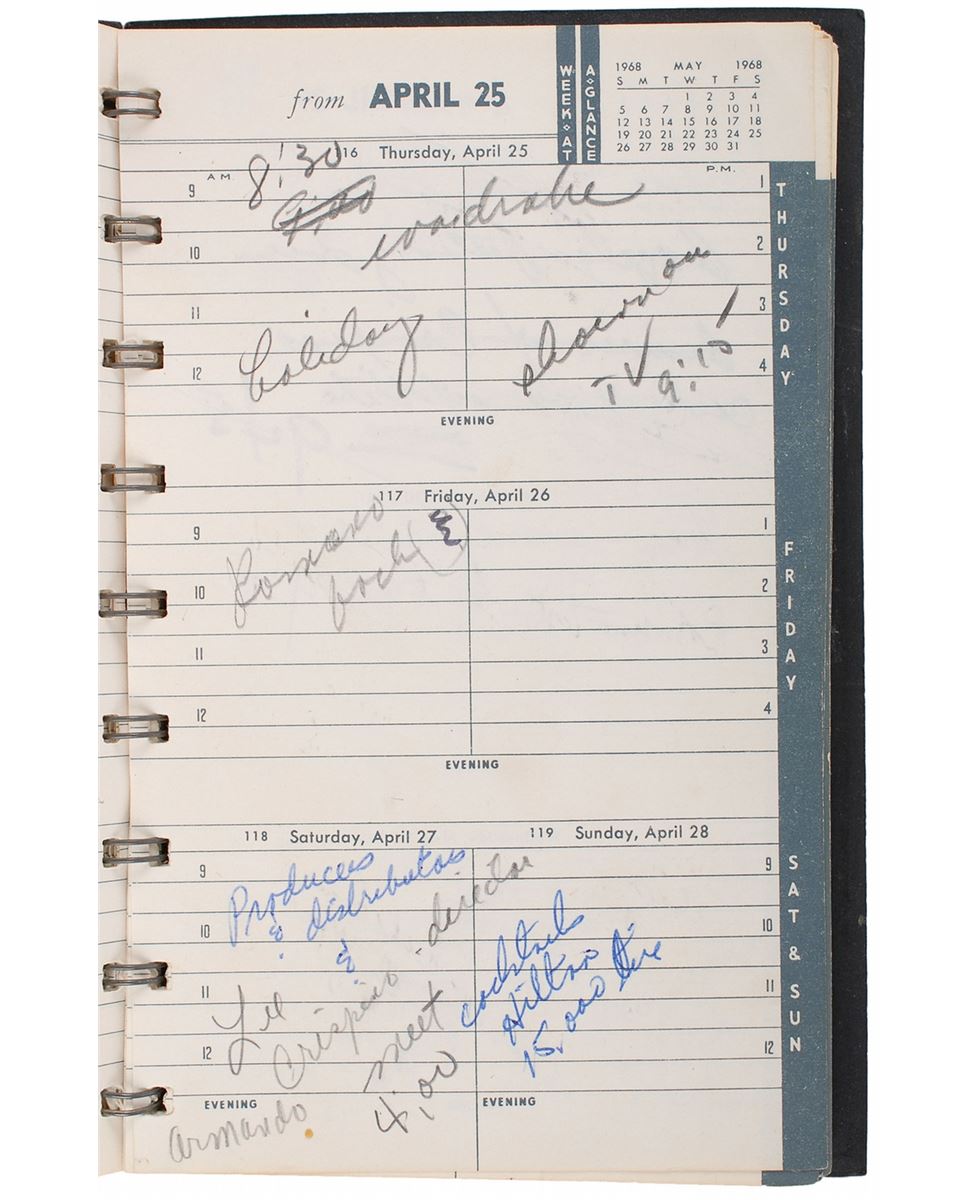 Crawford’s personally-owned and -used 1968 date book, 4.25 x 6.5, containing over eighty pages with entries in Crawford’s hand. Among these are: “Movie: Good, Bad, Ugly. $7.50”; “Dentist”; “Expenses, Receipts”; “Producers & distributors & directors”; and “TV 5:30 rehearsal.” General wear from use, some pages loose, and stains to a few pages, otherwise fine condition.