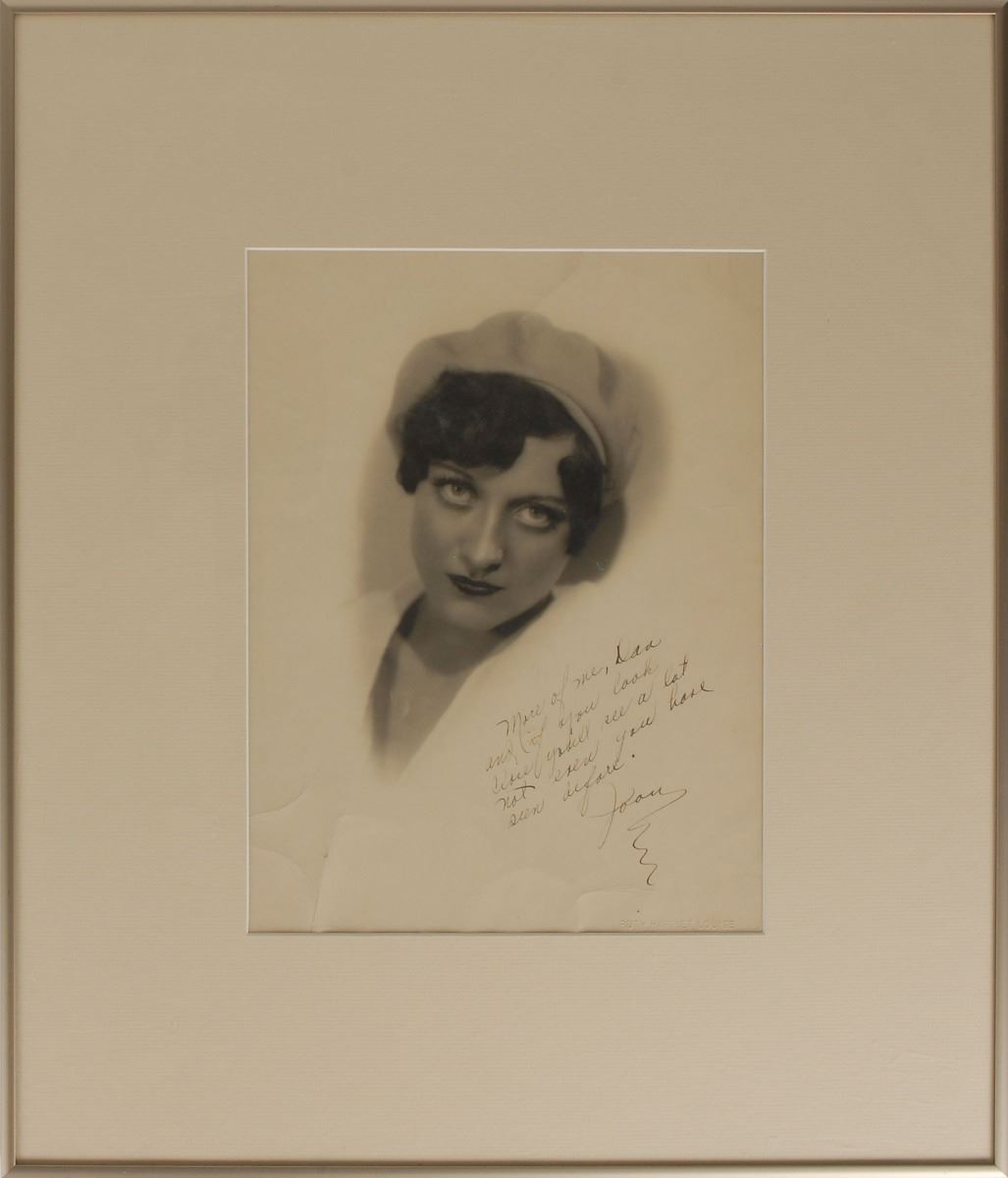 Stunning vintage matte-finish 9.75 x 12.75 portrait of Crawford gazing directly into the camera, signed and inscribed in fountain pen, “More of me, Dad and if you look close you’ll see a lot not even you have seen before. Joan.” Blindstamped in the lower right by important MGM photographer Ruth Harriet Louise. Impressively matted and framed. In very good to fine condition, with creasing in upper and lower blank areas, and some light scratches on Crawford’s left cheek area.