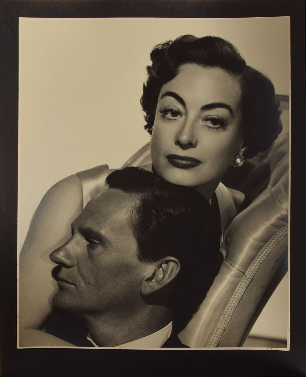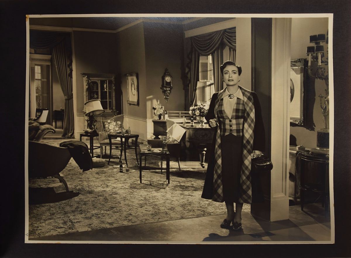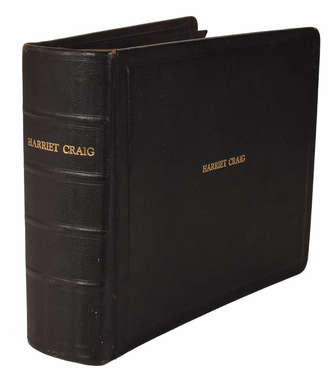 Wonderful vintage scrapbook from Crawford's 1950 film Harriet Craig, gilt stamped on the front and spine with the title, containing more than 60 matte-finish 7.5 x 9.5 stills from the film; a vintage fountain pen signature of Crawford is also loosely laid in. In fine condition, with curling to edges of the photos.